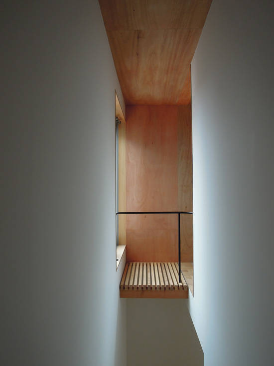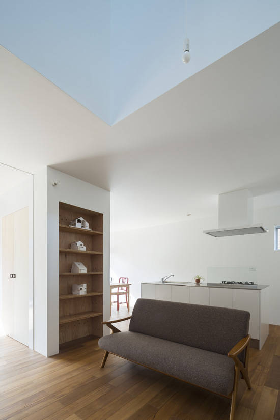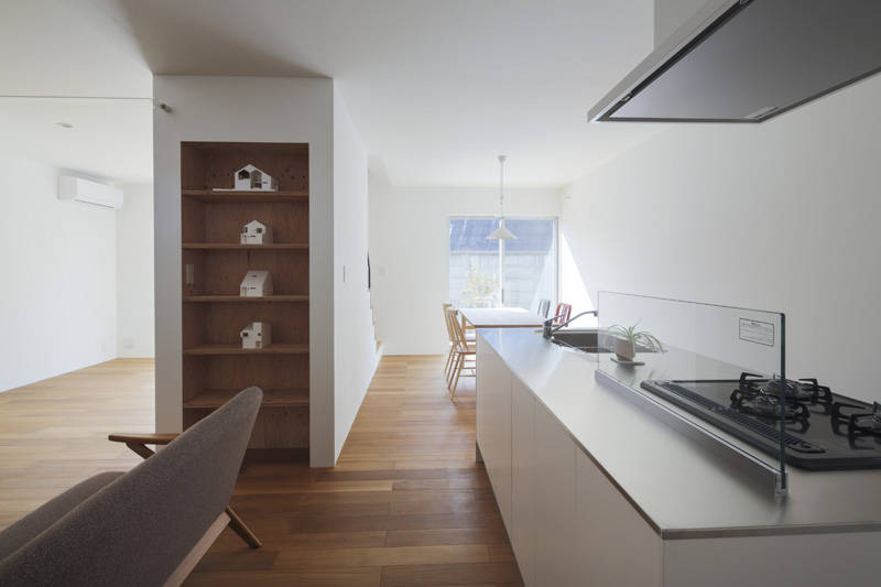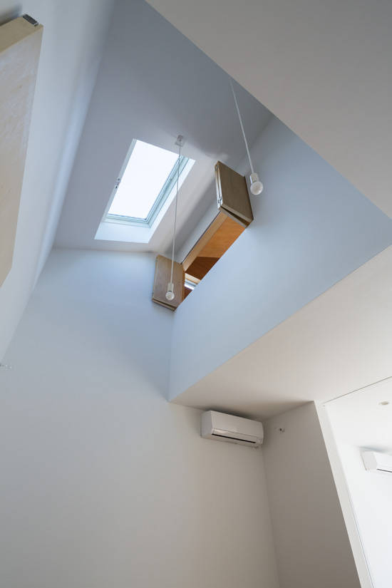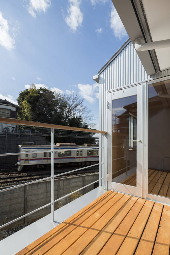 南側に庭を設けて建主が希望した「緑のある生活」を実現し、線路からの緩衝エリアにもなっています。静かな雰囲気の北側は建物の高さを抑え、道路との高低差は砕石で法面を作り新たな環境を提案しました。内部においてはリビングに設けた吹抜けがトップライトから光と風を取り込み居住性を高め、また1階にいても2階の子供部屋の気配を感じられ家族を繋げる役割も担っています。
