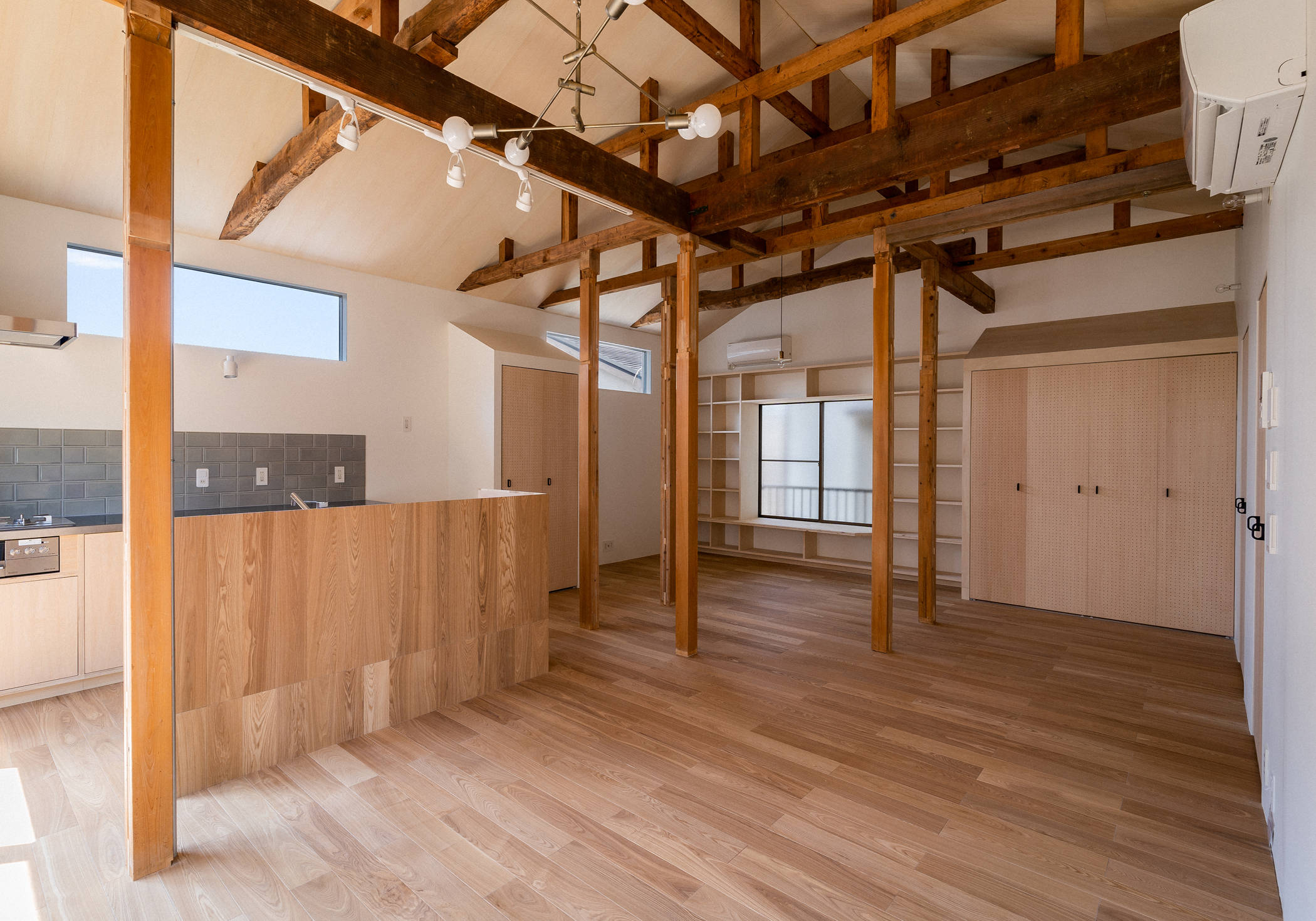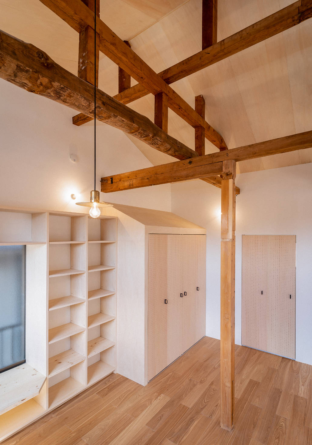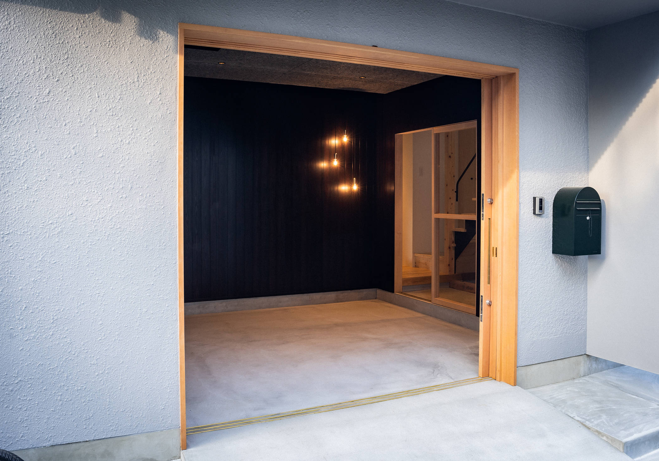 築40年の戸建住宅のリノベ-ション。要望のあった友人を招くスペ-スは2階に配置。2階にあった3つの和室と納戸をオープンにして明るく解放感のあるLDKを作りました。もうひとつの要望のアウトドアスポ-ツの収納及び手入れをするスペ-スは、1階8畳の和室を土間空間にして玄関も兼ねたスペ-スにしました。3枚引戸を全開にして外部と繋げアウトドアリビングのように。また夜はシアタ-ル-ムとしても楽しめます。おおらかで気持ちのよい2階のリビングと落ち着いた空間の1階リビング。2つの異なるリビングを楽しんで欲しいです。