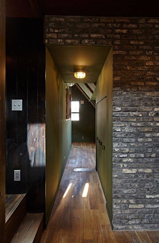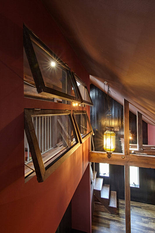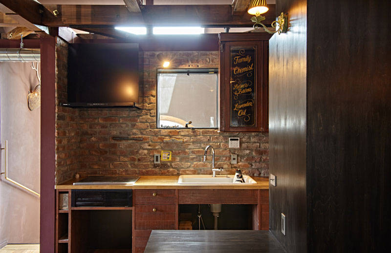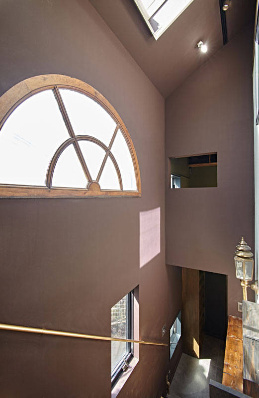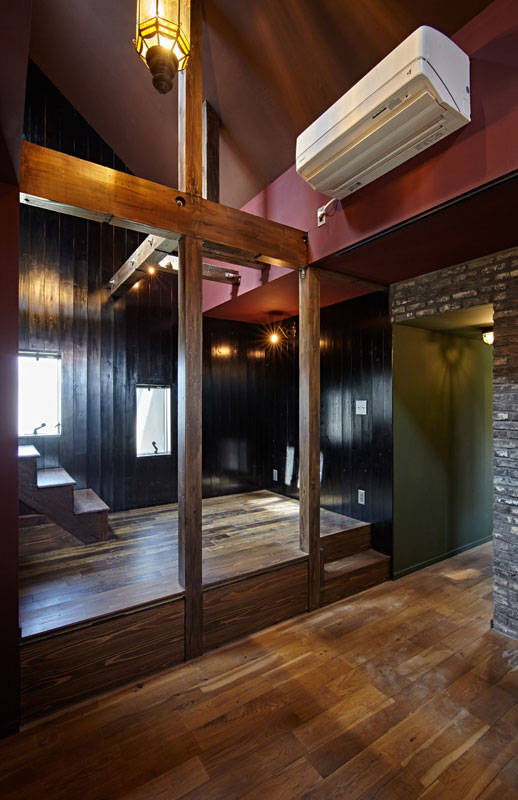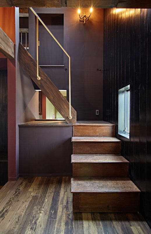 木造2階建てのリノベ-ションです。「飼っている大型犬が階段をスム-スに上がり降りできるようにしたい」との要望がありました。既存のスペ-スで解決するのは難しかったので、広くてゆるやかな勾配を持つ階段を増築しました。機能だけでなく外部のような心地よさを持つ空間にしたかったので、既存の外壁をそのまま見せベンチやトップライトを設けています。居住スペ-スはトイレとお風呂以外ドアのない空間ですが、各居室手前にある短い廊下が空間を繋げつつ死角により場所の独立性を保つ構成をとっています。もう1つ階段をplusしていて、リビングからロフトへの階段です。施主が持っていた階段状の収納家具を利用しました。特徴的な色使いとアンティ-ク家具、照明器具は施主の世界観を反映したものです。この色使いはくせになりそうです。