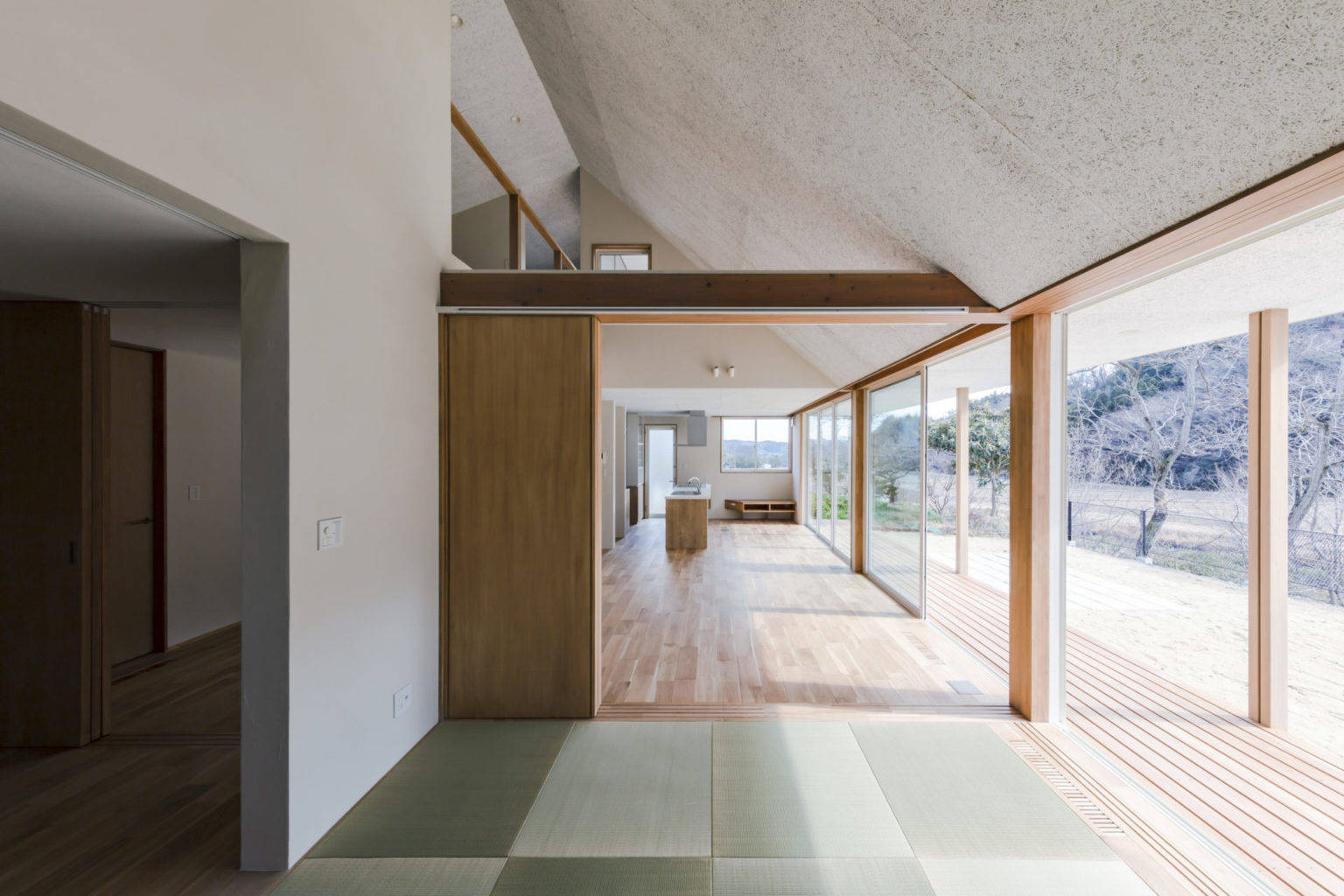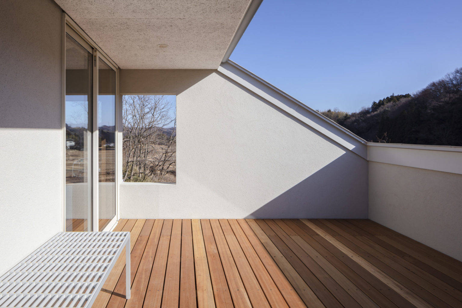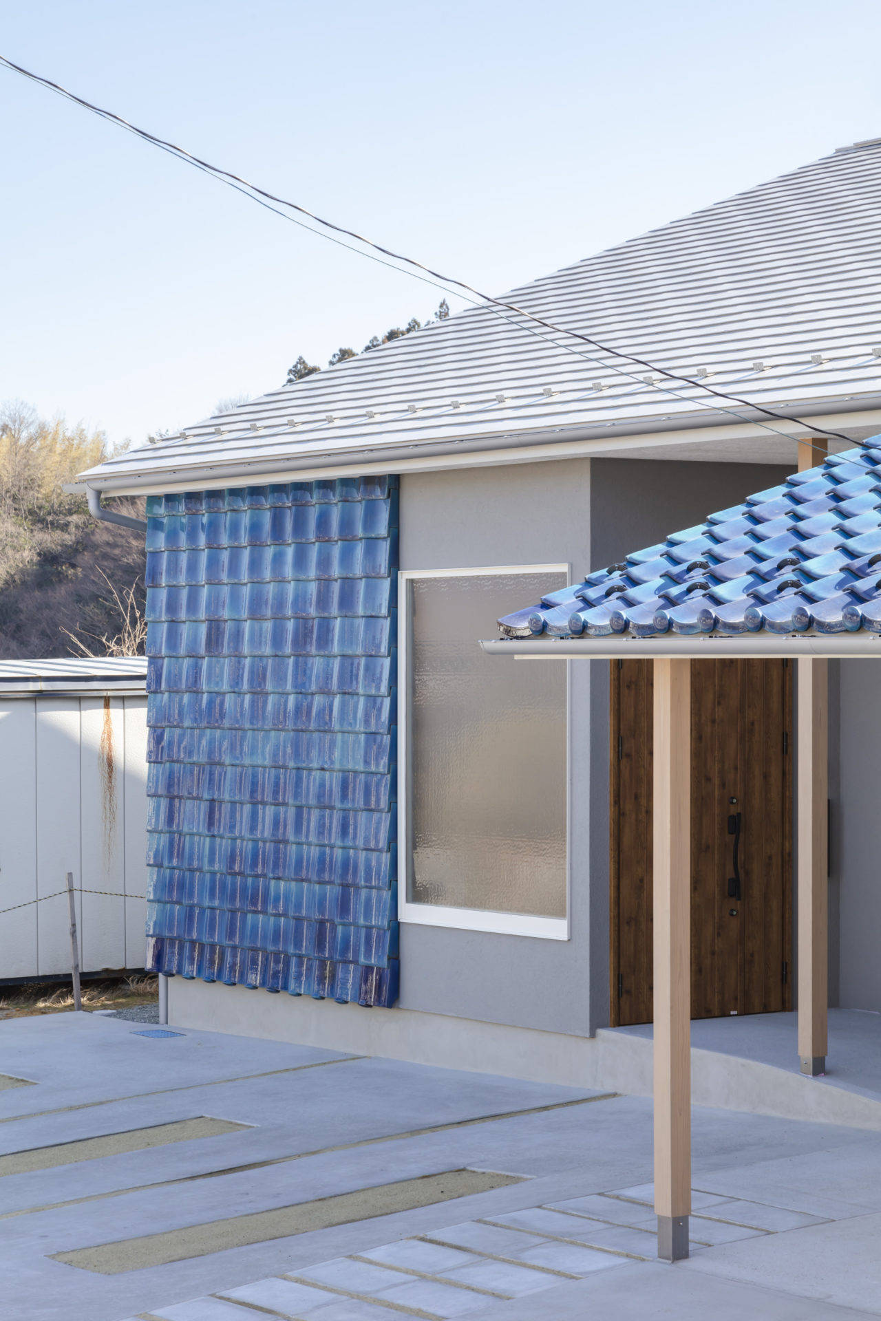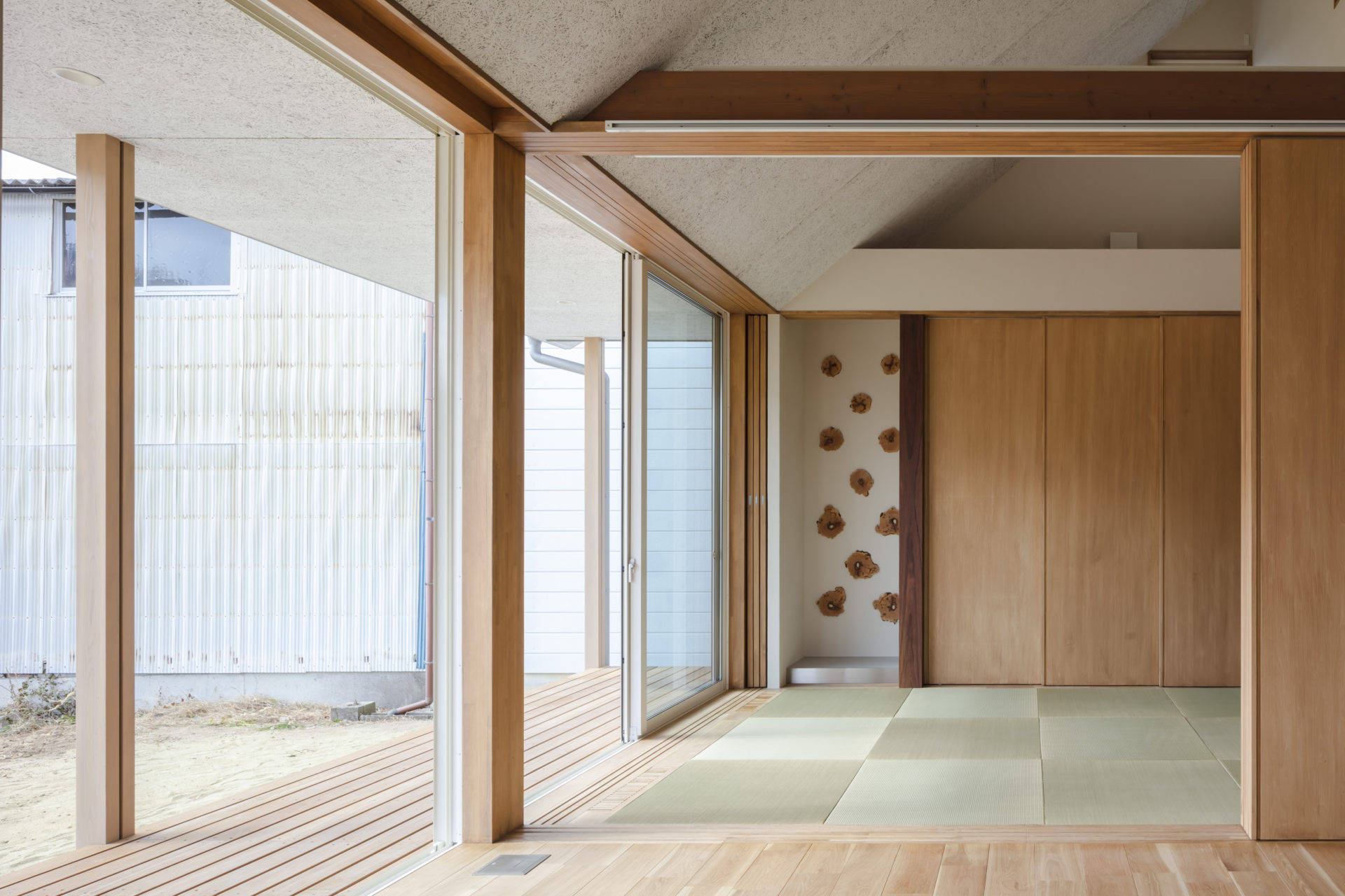 屋根に葺かれていた青緑瓦は、玄関の壁やカーポート屋根に再利用した。家族にとって「家に帰ってきた」と思える構えになることを目指した。またかつての屋根には下屋があり、その上がテラスのように使われていた。とても眺めの良い、子供たちのお気に入りの場所だった。新しい家ではシンプルな切妻屋根の中にぽっかりと穴を空けて、そこをテラスにした。1階の居間とも窓を介して繋がることで、立体的な居場所づくりができた。他にも慣れ親しんだ家事動線や、窓からの景色などの形の無いものから、玄関化粧柱の曲がり木を転用した床の間などの、素材を引き継いだものまで、さまざまな方法で、記憶の風景の続きとして、ここに紡いでいった。