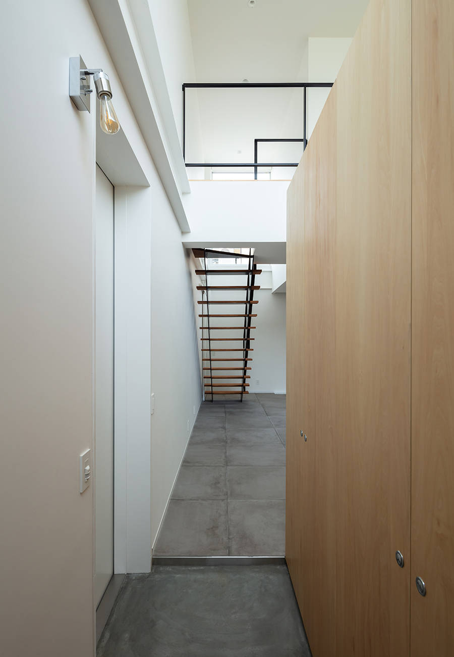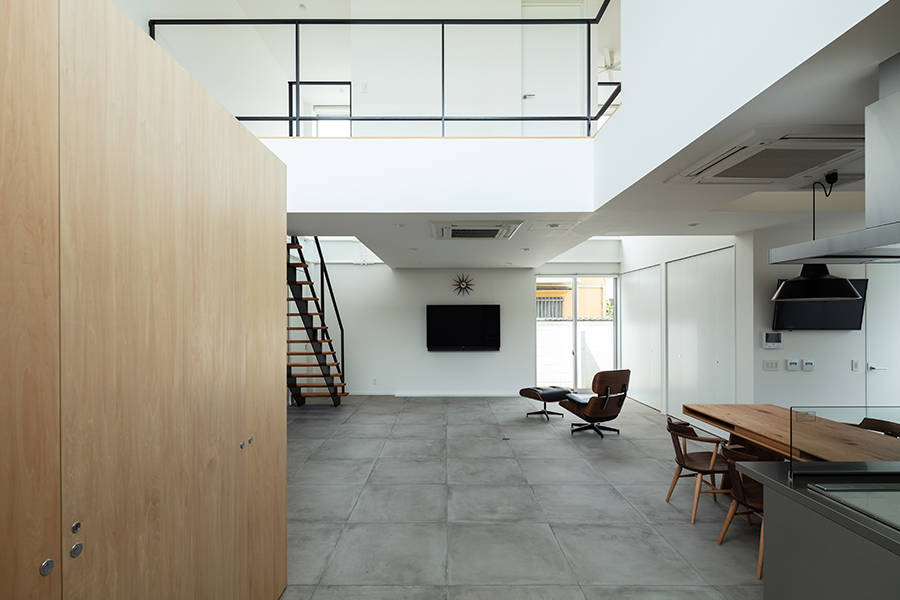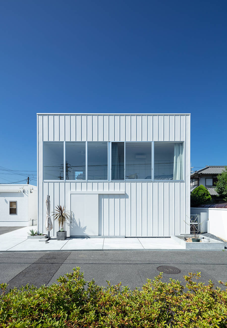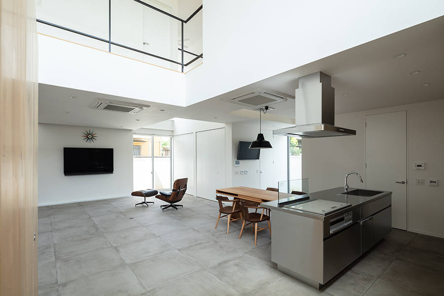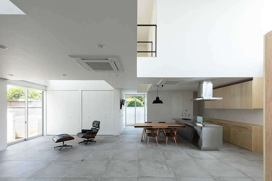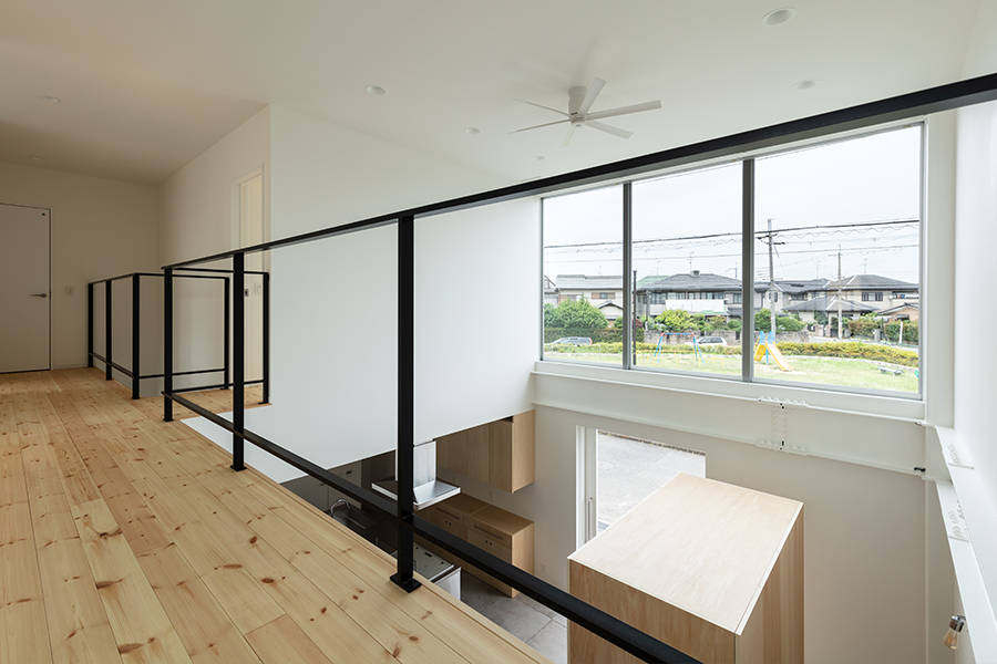 そこで1階にはリビング・ダイニング・キッチンと水周りを、2階には寝室と子供室を配しました。建物は9.1m×9.1mの平面形状とし、リビング・ダイニング・キッチンに柱がないように鉄骨造としました。幾つか吹抜けを設け、吹抜けにはハイサイドライトを設け、1階に自然光を落とすことにしました。2階の窓はハイサイドライトと連窓にしました。