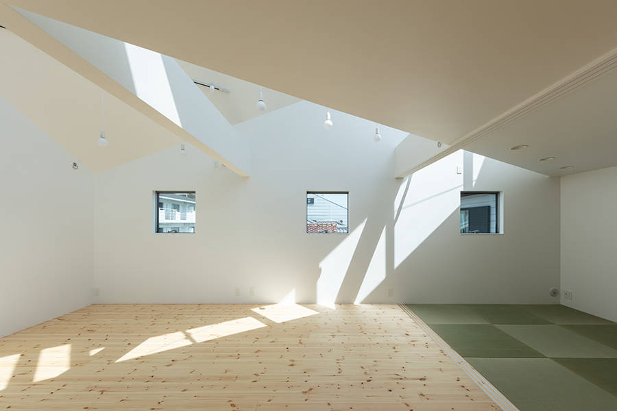 プライバシーの確保から、北側の前面道路側には、そのままでは自然光を取り込むための大きな窓を設置できないため、2階のバルコニーには視線を遮る壁を設置し、バルコニー上部からの自然光をリビング・ダイニング・キッチンに取り込んでいます。3階の寝室は、建物の対角線状に屋根(天井)を斜めに折り上げ、ハイサイドライトを設置し、南西側上空からの自然光を取り込んでいます。また、ルーフテラスも壁で囲われていて完全にプライバシーが確保されています。