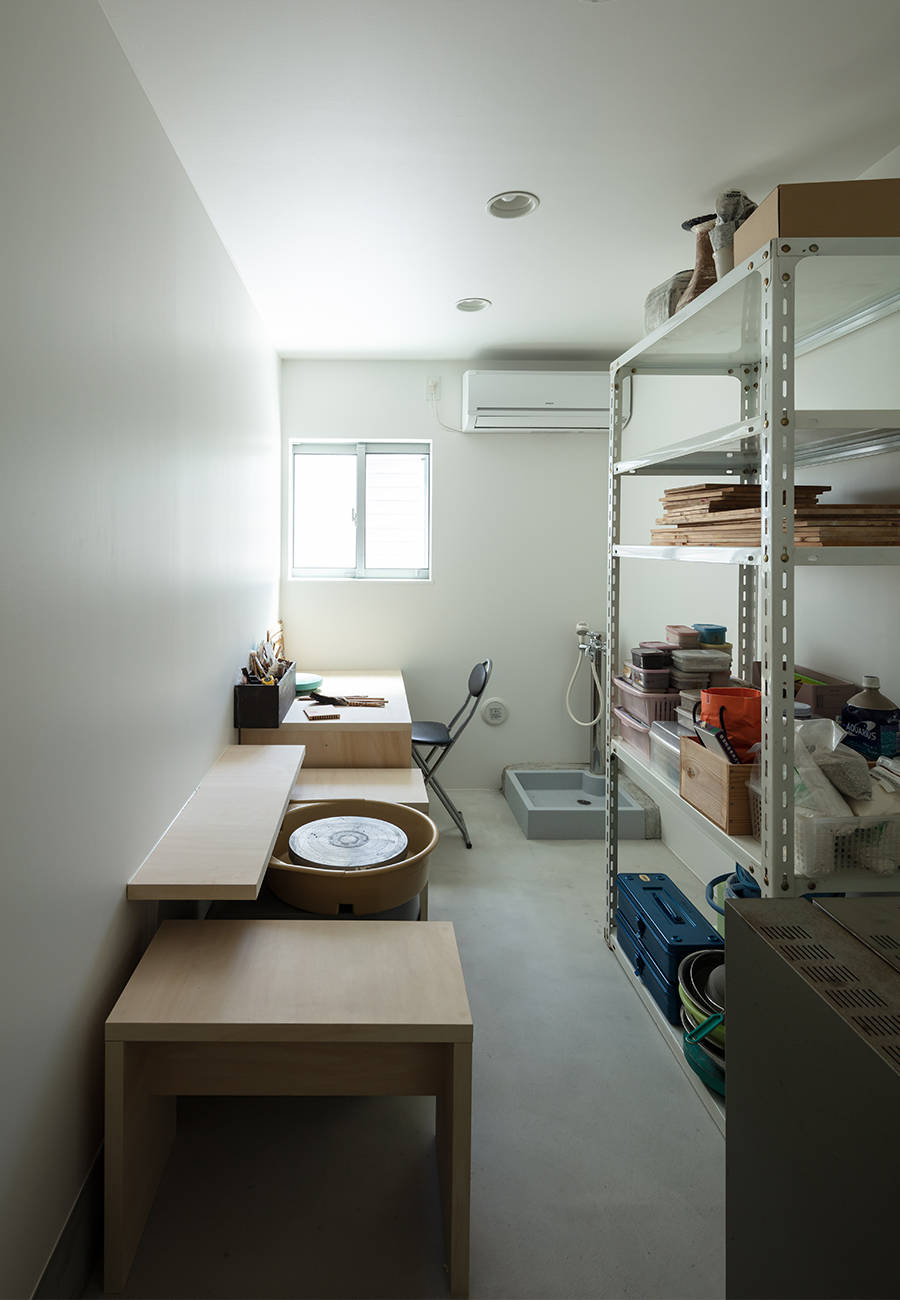 1階にはガレージと陶芸室と水周りを、2階には将来奥様が料理教室をしたいとのことでリビング・ダイニング・キッチンを、3階には寝室を、そして屋上にはルーフテラスを配しました。