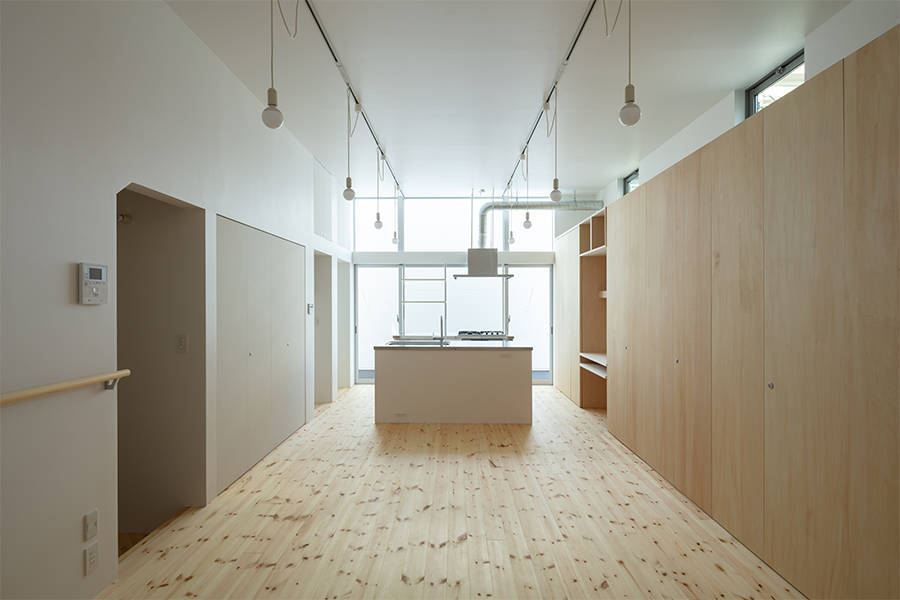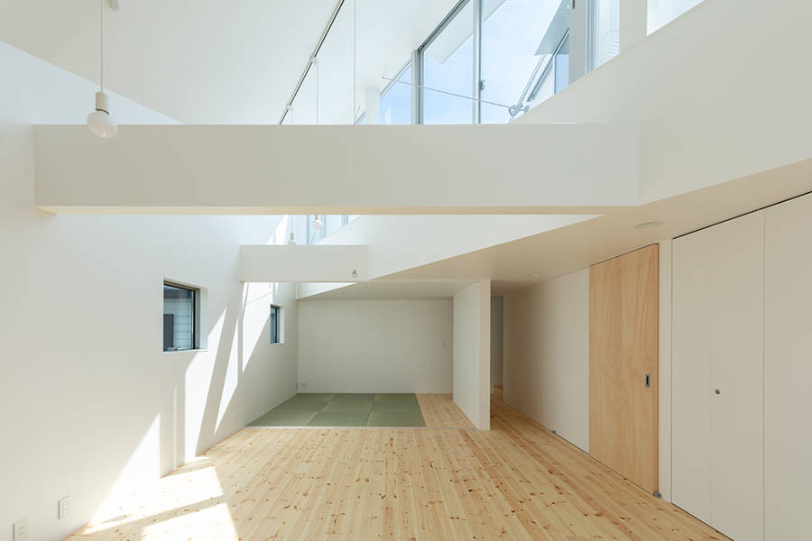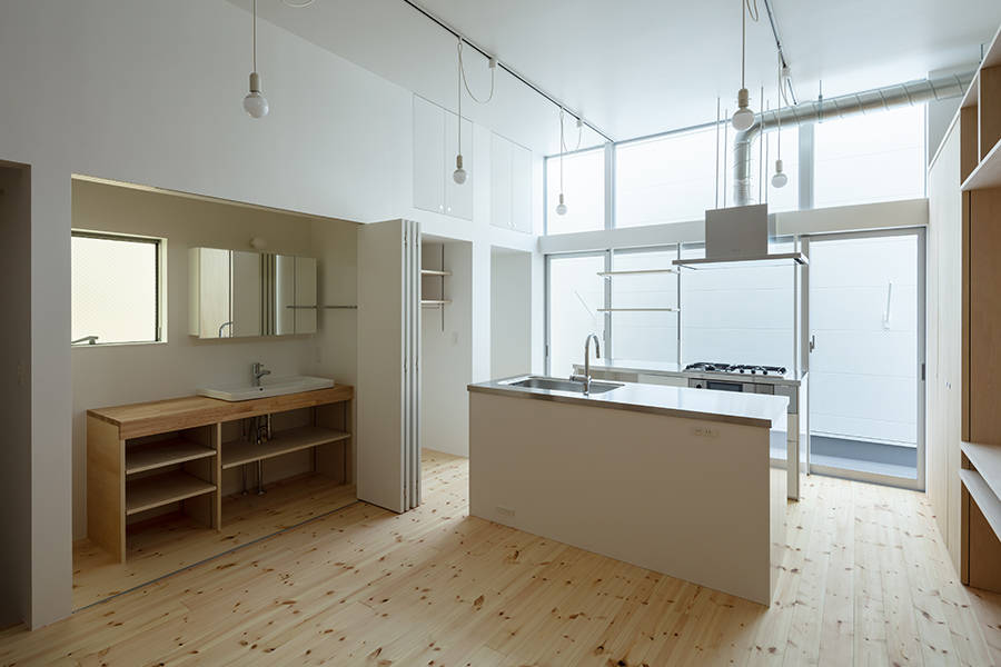 敷地は大阪市の市街地で、敷地周辺は住宅や保育園や小学校や公園が混在している地域です。この敷地に建っていた建主の以前の住宅は木造3階建てで、南側、西側は隣地建物が建て込んでおり、自然光は北側の前面道路と東側の低層の隣地建物の上部から入るのみの状況でした。建主は、住宅の中に自然光が入ることを望むとともに、北側道路を挟んだ向かいにある4階建て賃貸住宅からのプライバシーの確保を望みました。