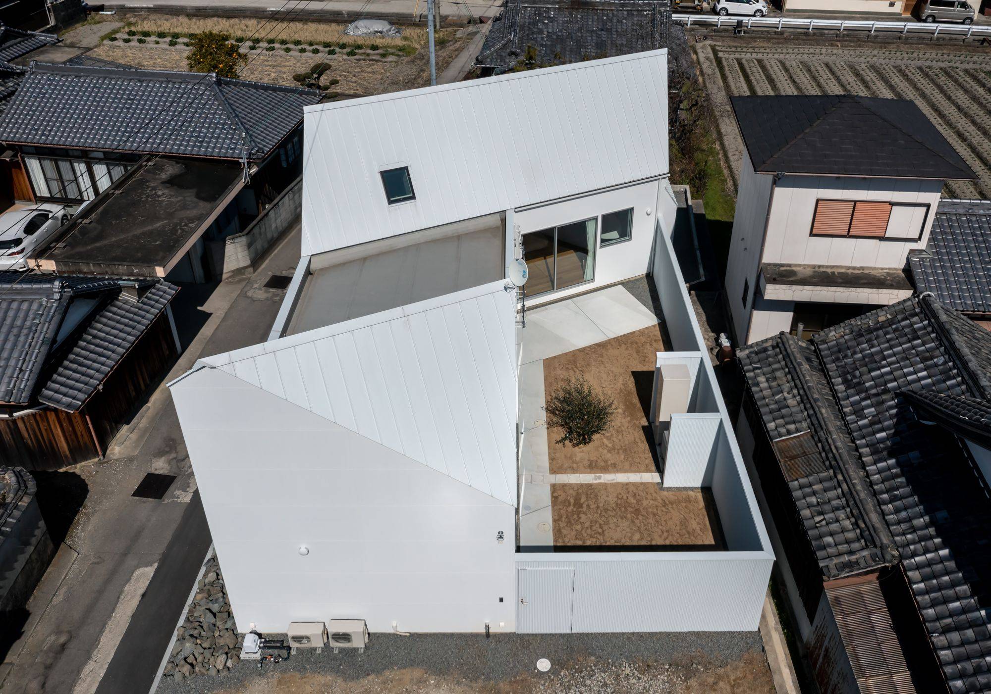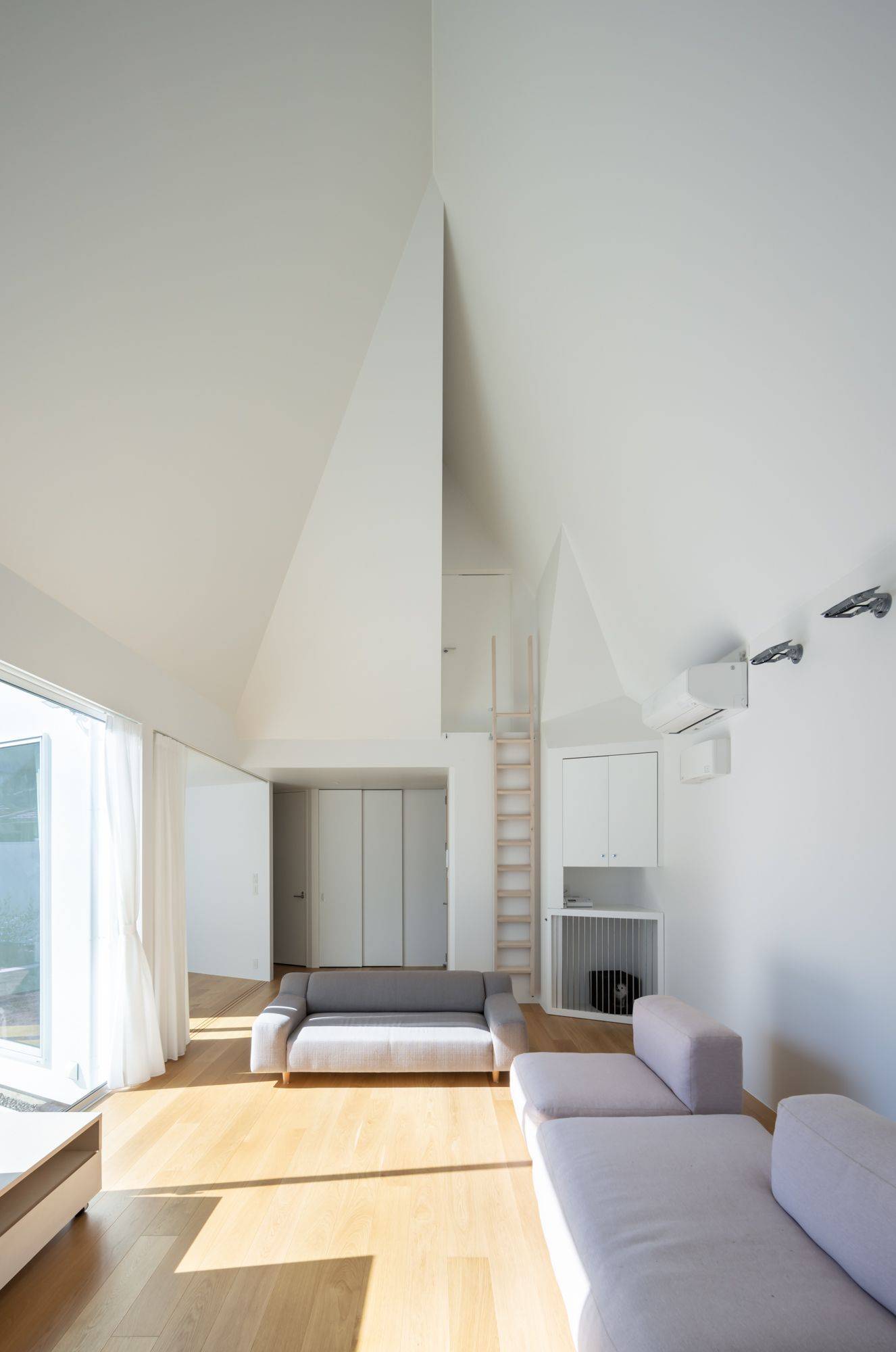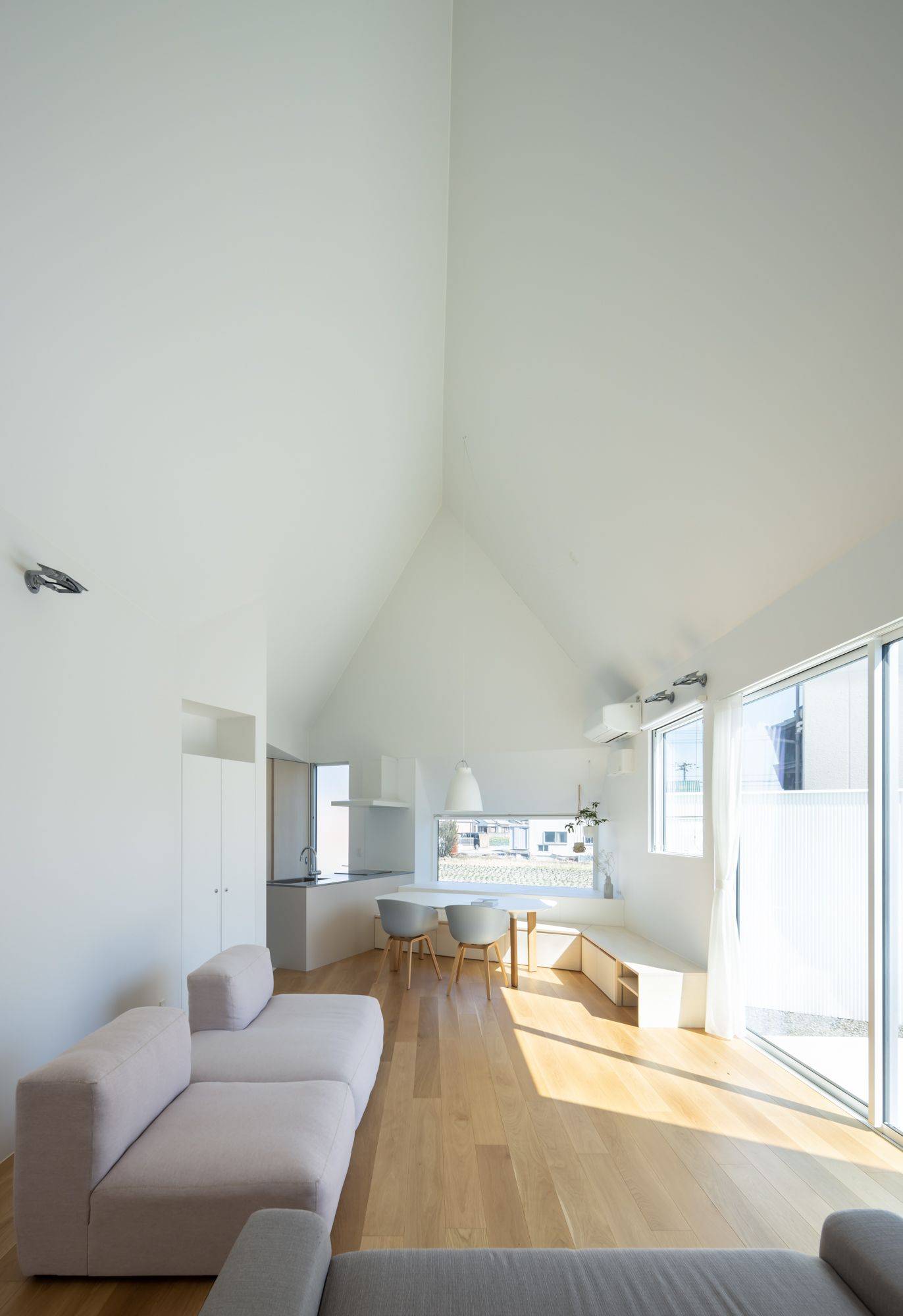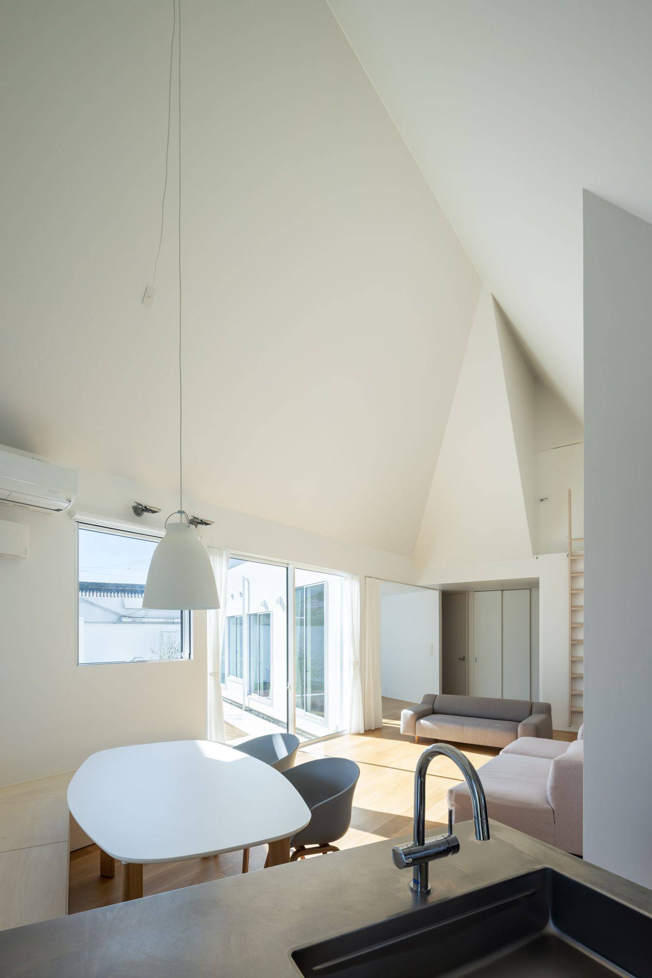建物は、約56度の勾配を持つ切妻屋根が2棟平行に配置されています。この2棟の切妻屋根は、平面グリッドに対して約26度斜めに回転しており、LDKから敷地北東側の農地への眺望が確保されるとともに、敷地北西側には駐車場が設けられています。妻側の部分は平面グリッドの直交ラインによって切り取られた形状となっており、その結果として生まれた複雑な形状の屋根の下には、その形のままの彫刻的な空間が広がっています。