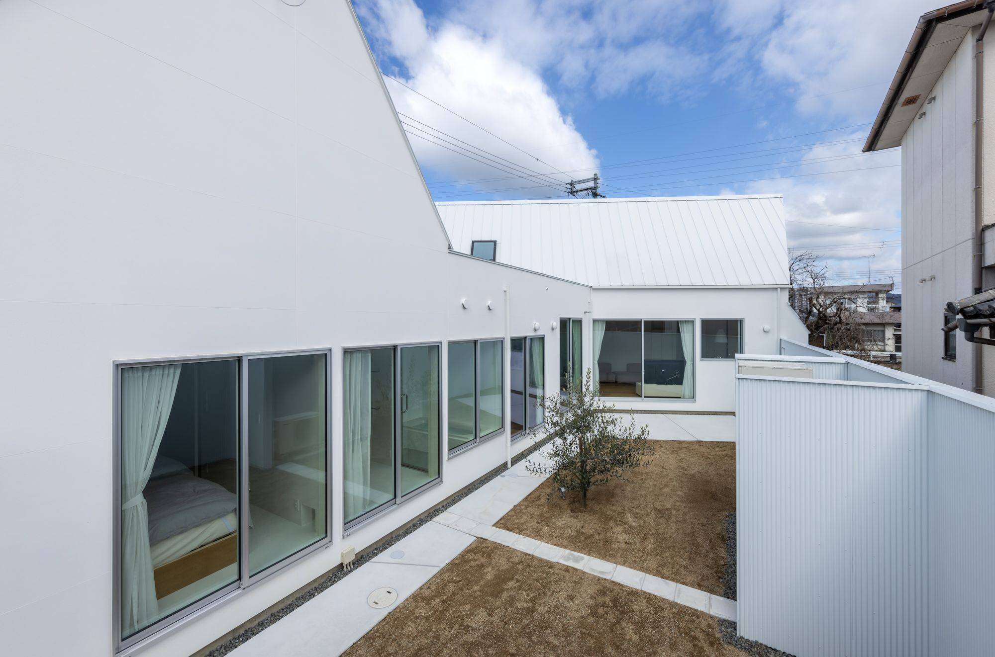 西側の道路に面する側には窓を設けず、各居室は中庭に向かって開かれています。浴室も同様に中庭に面しており、プライバシーは中庭を取り囲む高い壁によって確保されています。