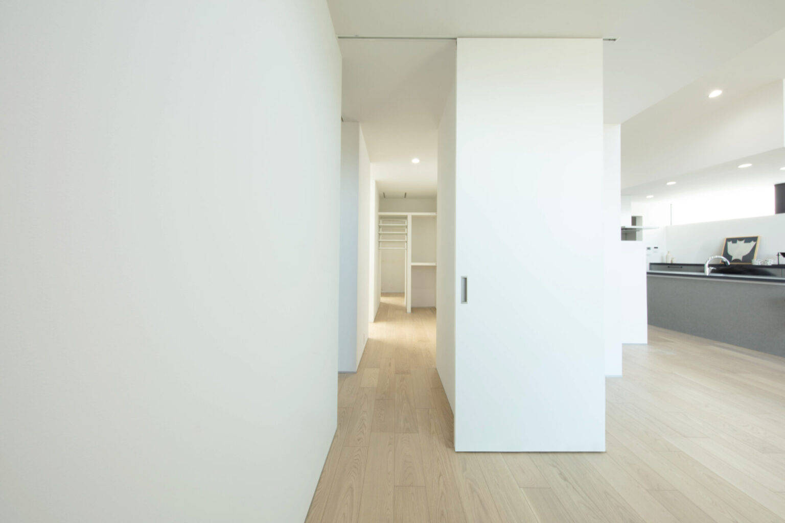空間どうしが心地よくつながることで、家のどこにいてもスムーズに移動できます。そのため、毎日の家事や生活も快適に、効率よくこなせます。例えば、玄関からパントリー、キッチンへと直結している設計により、食料品などの買い物後、そのままパントリーへ手間なく収納できる便利さが生まれます。