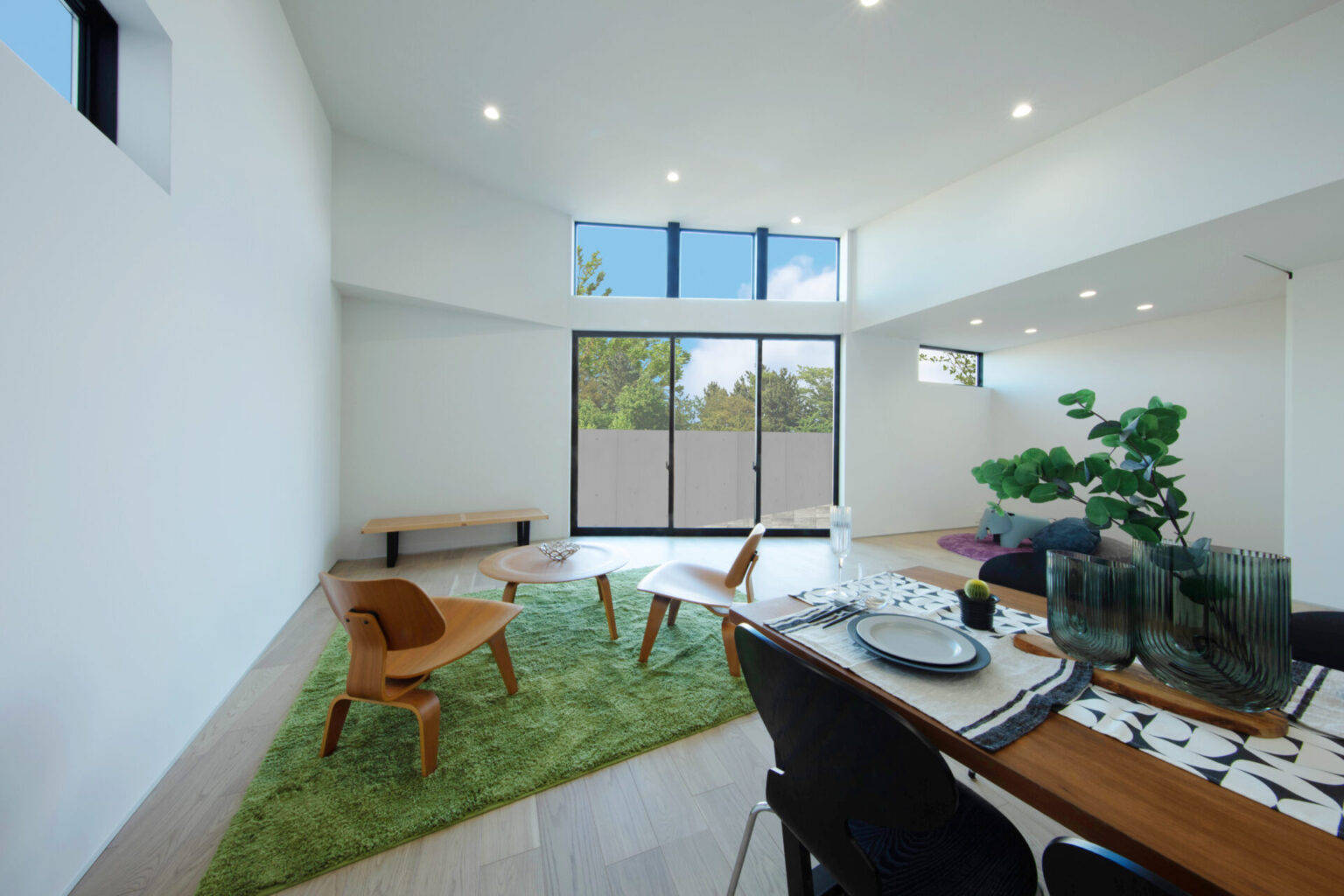 宇都宮市の住宅街に、片流れ屋根のモダンでスタイリッシュな木造平屋建て住宅をご提案。家族のライスステージに寄り添い、住まいも一緒に変化していける家。そんなイメージが込められています。