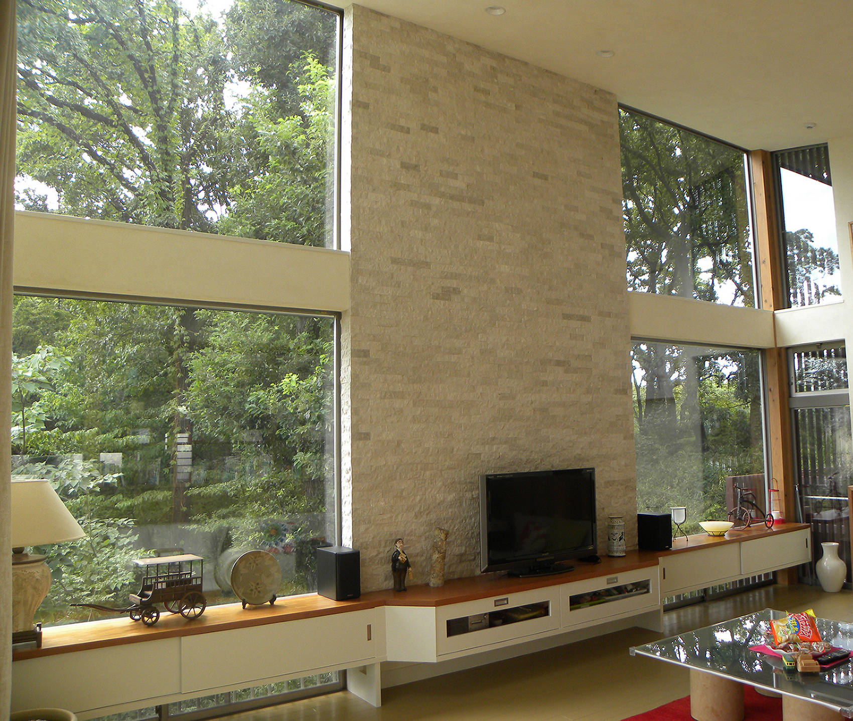 ここでも弊社得意な手法で、窓の役割を明確にして家中に光と風を通します。隣地の緑を借景とする窓は大きくても安価なFIX窓、採風窓はカウンター下の目立たない位置に、眺望デッキ側は安価な引き違いサッシ、このように、景色を取り入れる窓、風を取り入れる窓。人の出入りの役割を明確にして限られたコストで窓を設計します。