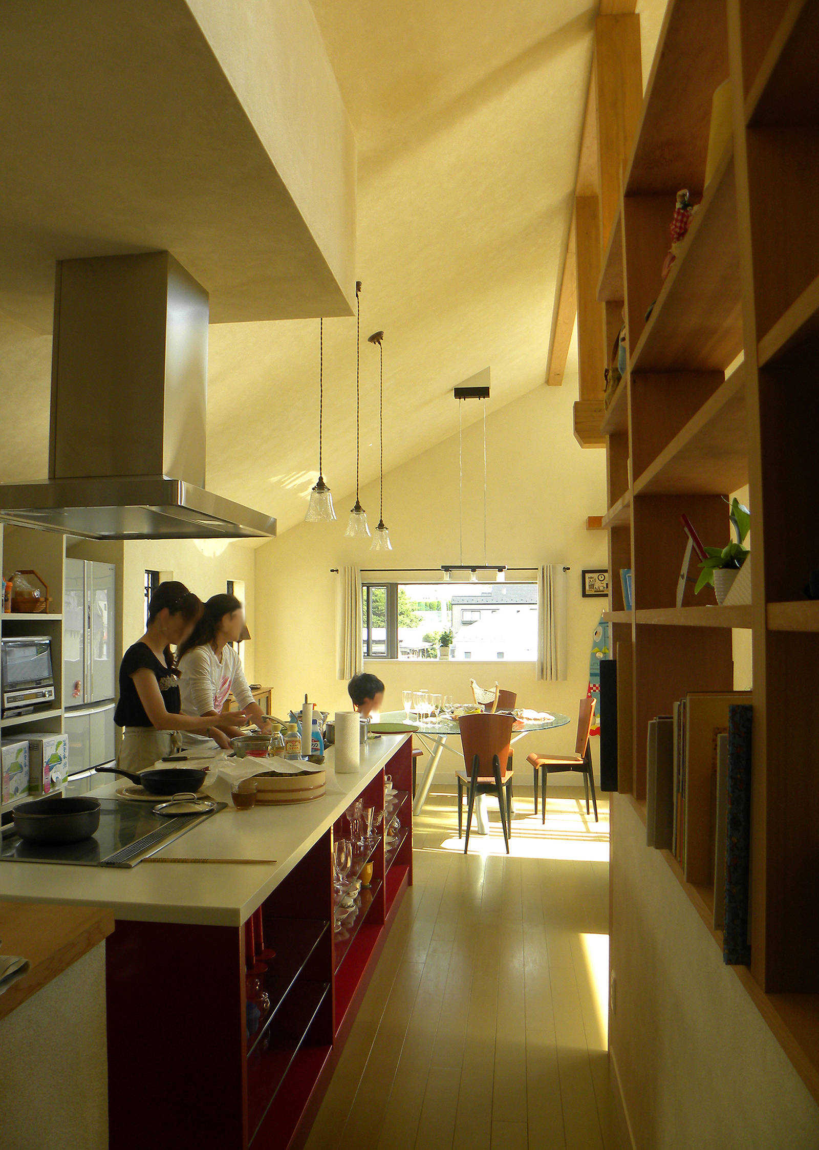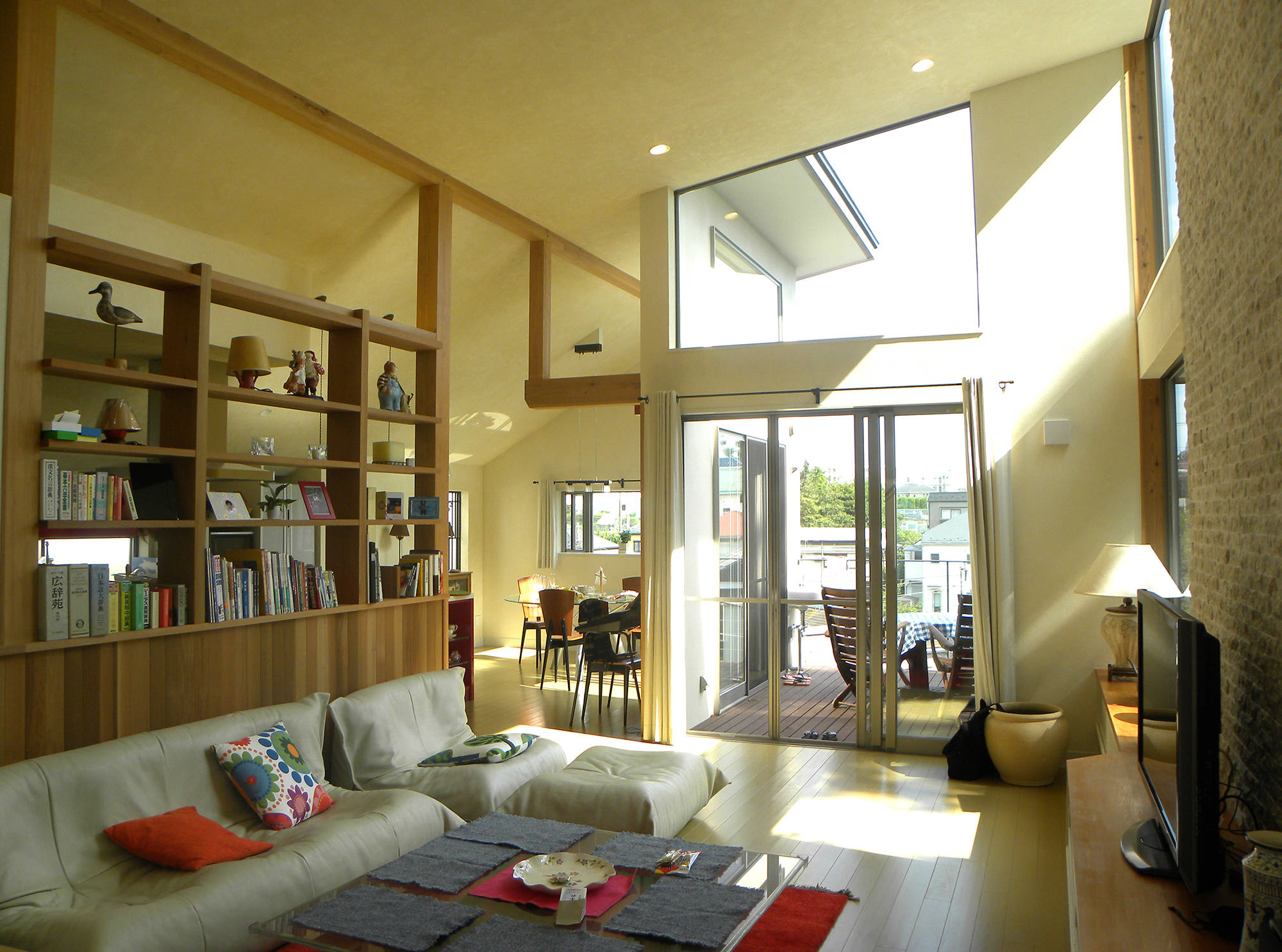 住まい手は、アパレルのお仕事をしているので、見せ収納が得意でおしゃれに暮らすことに関してはプロです。そこで、2階LDKはキッチンと見せる飾り棚を中央に配したオープンな空間を提案しました。さらに、南斜面のひな壇敷地なので南向き眺望デッキをリビングとダイニング双方から出られる様に設け、さらに隣地斜面緑地を借景と採風としてリビングに取り入れることにしました。代表的な仕上げ材は、壁天井は全て洋風しっくいで床は国産桧の板張りです。