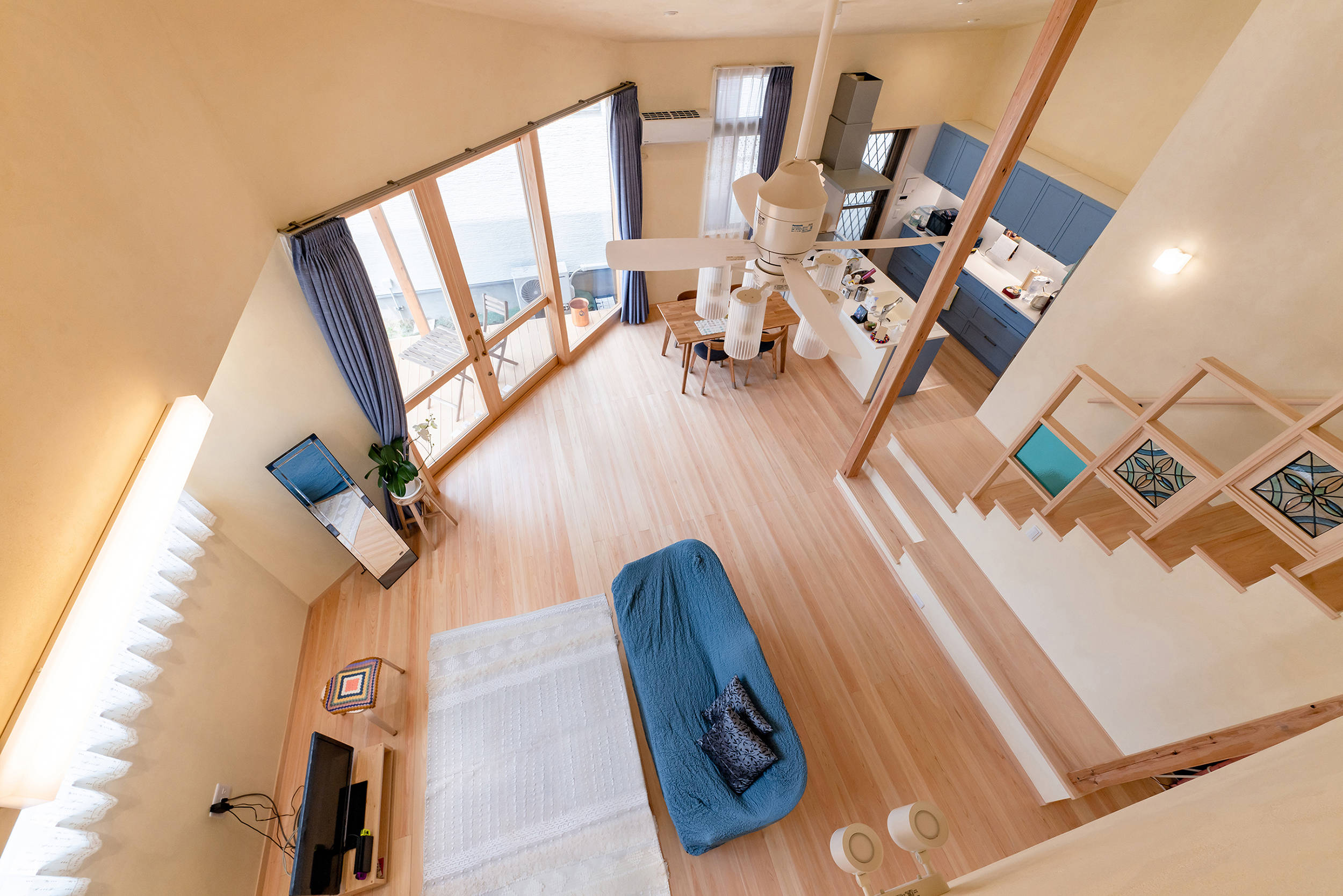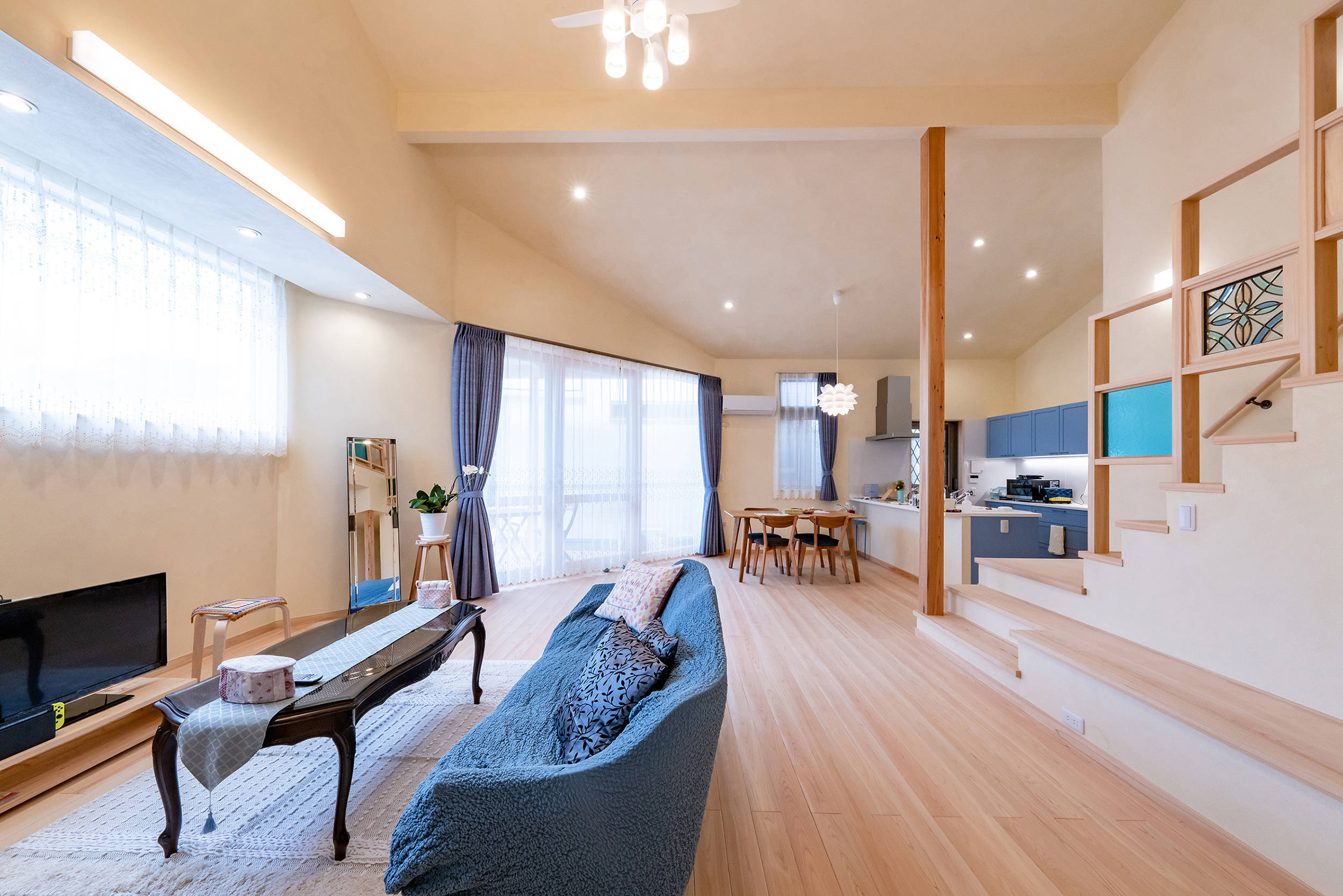 弊社の得意とする手法で室内に光と風を通します。そして室内に降り注ぐ光は、小さな凹凸のある漆喰壁と階段や室内窓の色ガラスを優しく照らし出します。