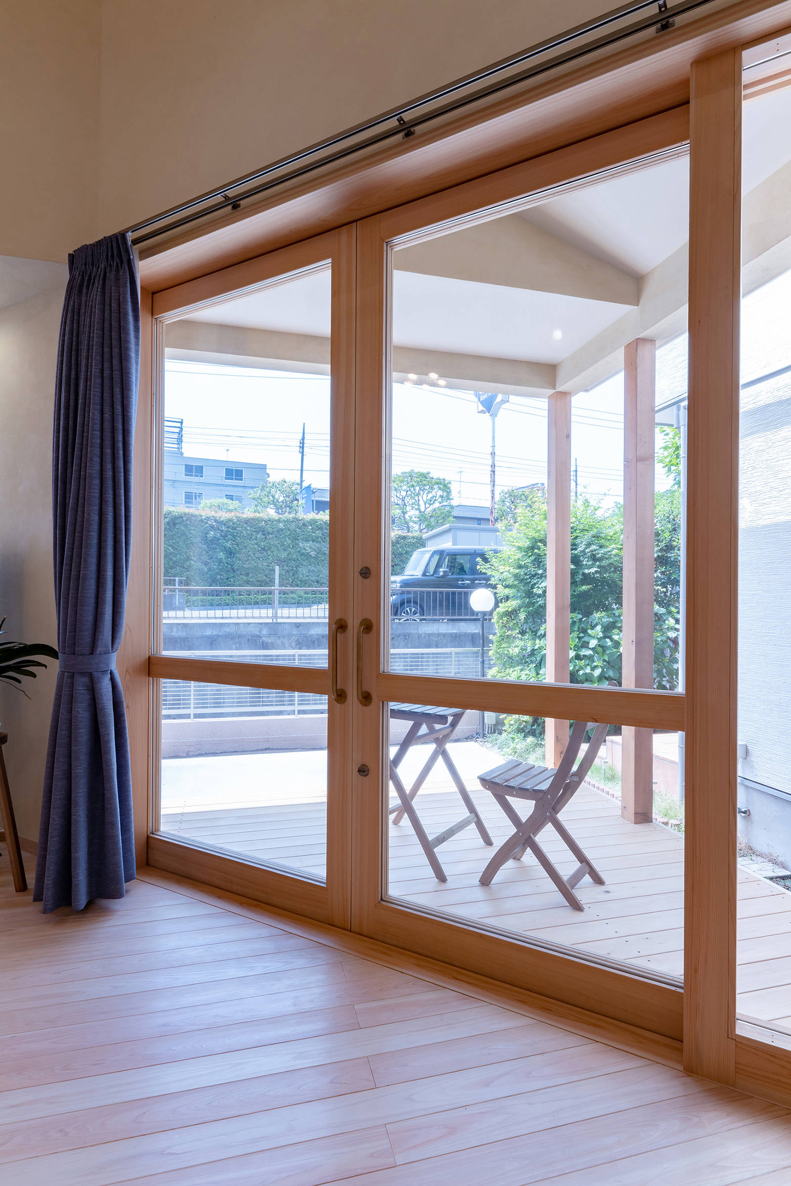 一番の課題は、南北に短く東西に長い敷地に建物が3棟建っていて、その真ん中にこの家があることでした。東は自身の経営する医院、そして西は家族の家なのでただでさえ狭い建物の南は通路になっています。つまりここは狭小敷地でした。そこで、私が提案したのは建物の一部を三角に欠き、そこを小さな庭とするとともにそこから明かりと風を取り込むことでした。また夫婦2人の小さな家なので、トイレと浴室など水回りは1階からも2階からもアクセスしやすい中2階にコンパクトに設けることで1階LDKはとても広く出来ました。さらにLDKは吹き抜けとしそこに2階寝室窓を面させる事で、家族がいつも繋がれるようにしました。このような室内窓は弊社の定番手法です。また家の中心となる吹き抜け階段は奥様の好きな色ガラスを用いてデザインしました。