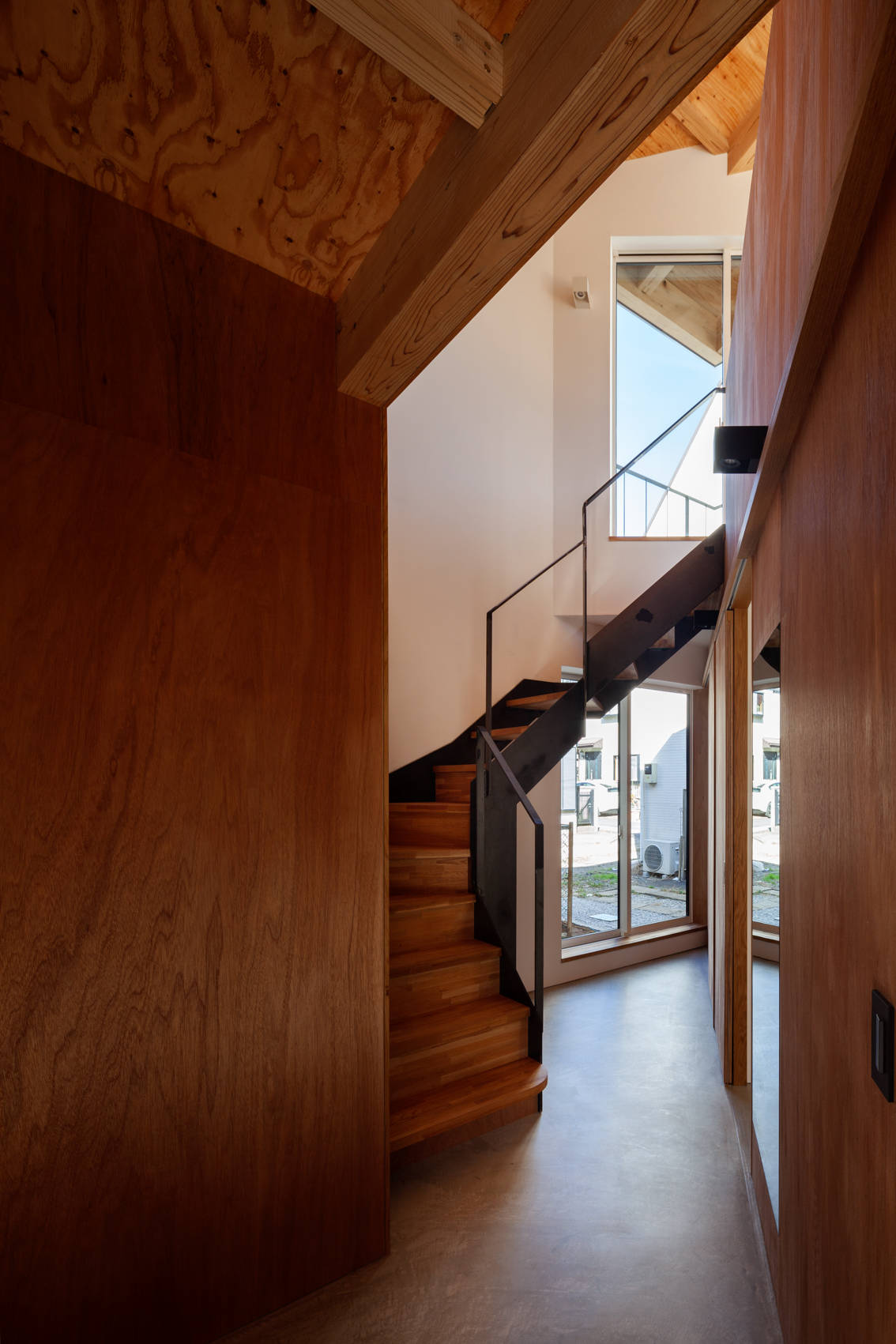 計画地の南面の遊歩道と北面にある私道を、敷地内のピロティや小径、室内の路地的空間(径)へ延伸させることで、地域との接点や、室内から道/径への視線の抜け感を生み出します。