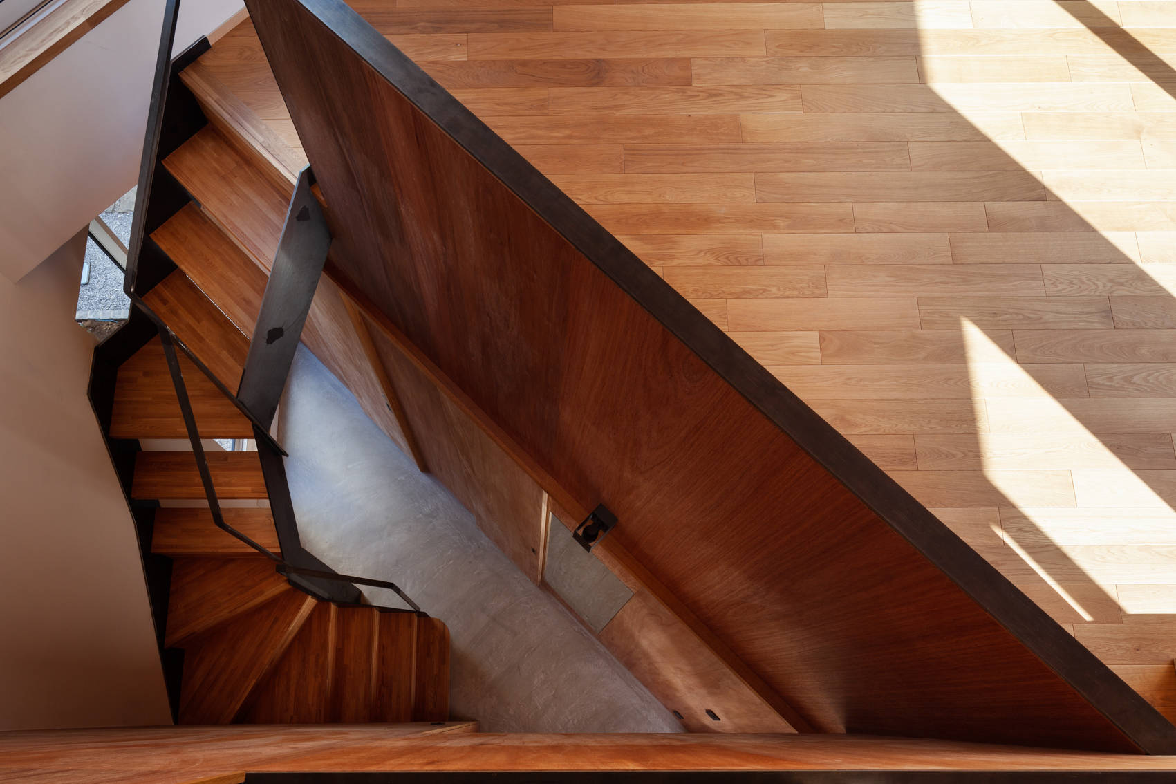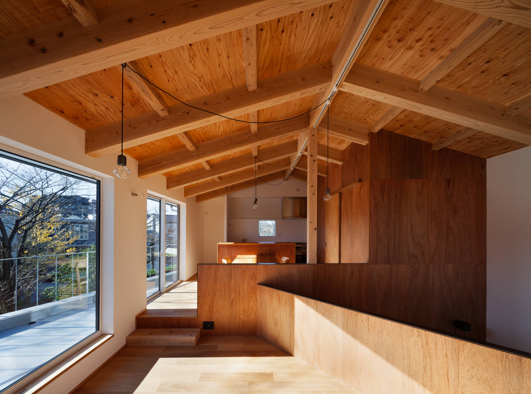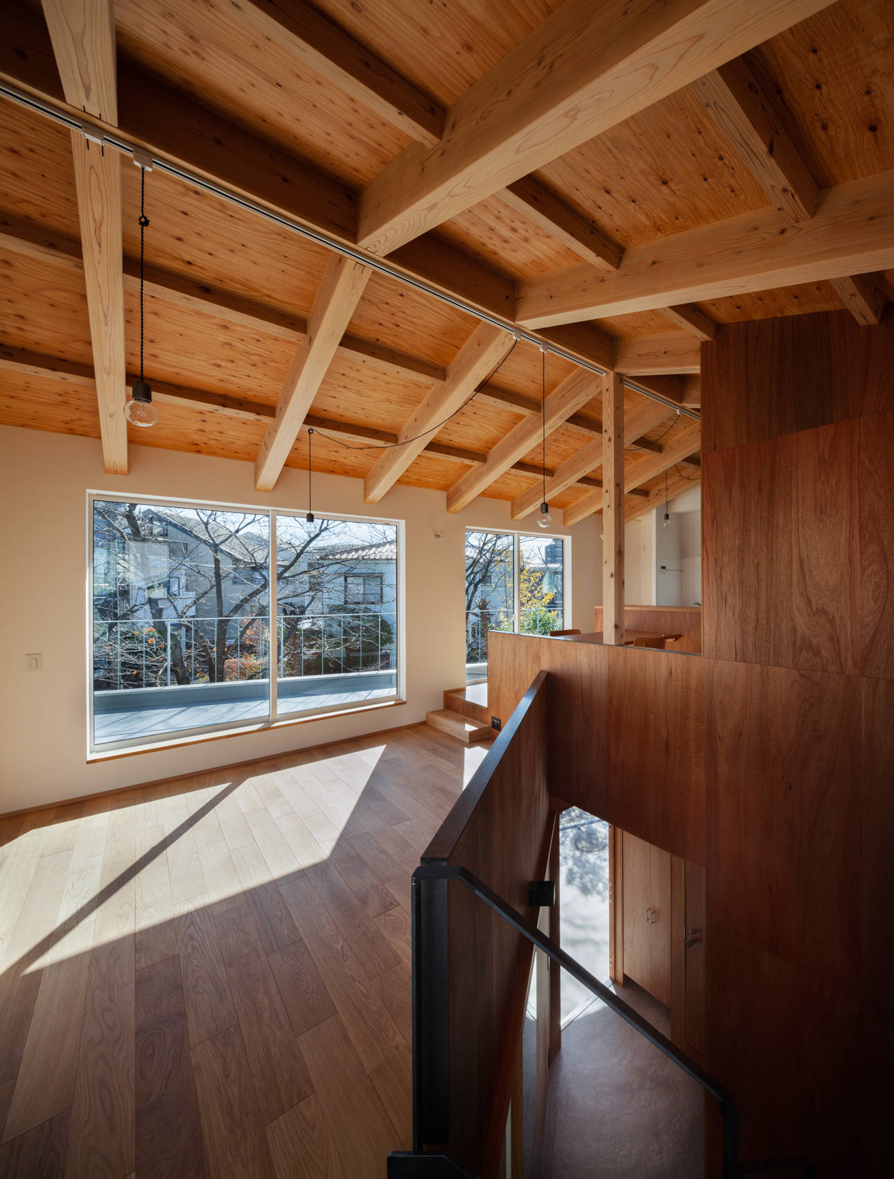 昭和後期に宅地造成された北側の私道に接する旗竿敷地でありながら、南面の遊歩道にも接するという、特殊な敷地(環境)を活かした計画です。