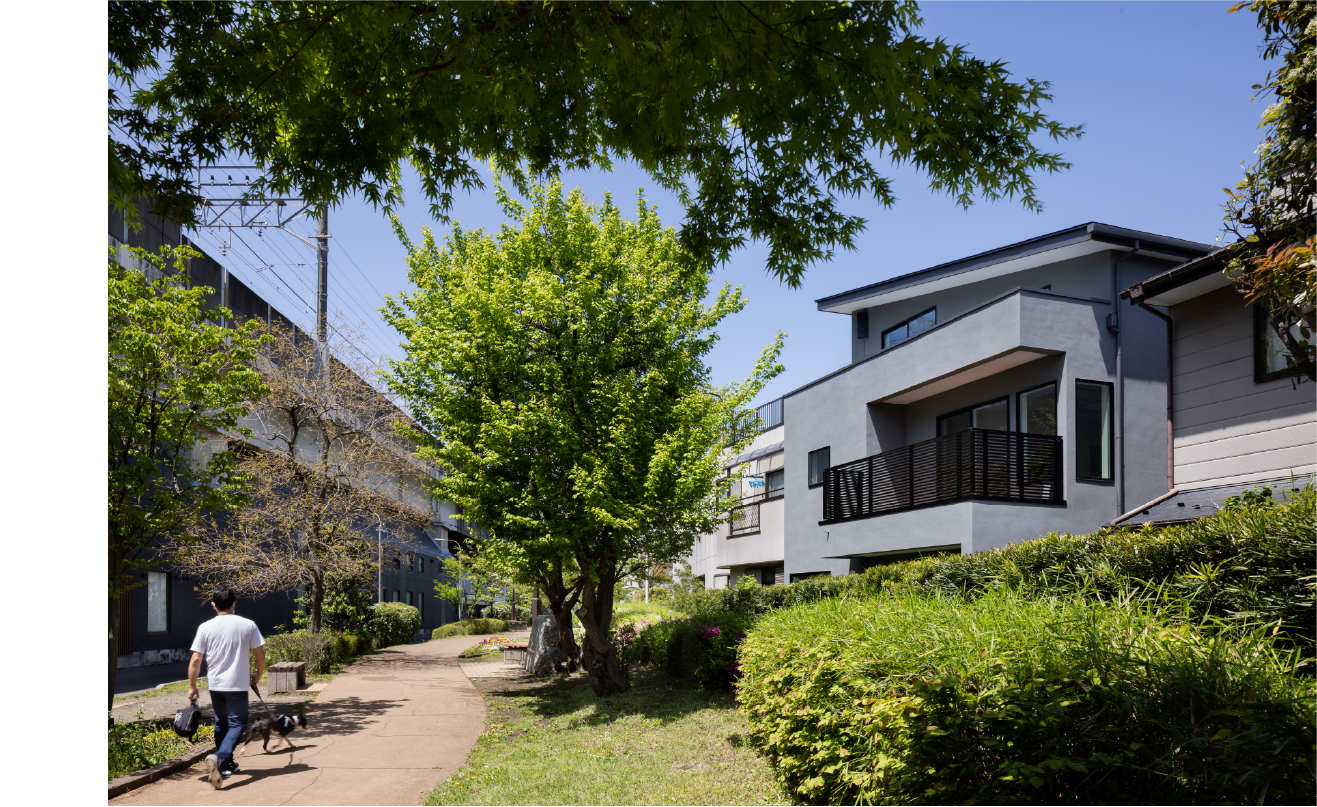 戸建住宅が建ち並ぶ計画地は、北側は道路に接し、南側は敷地より1m程高くに遊歩道があり、敷地の間口に対して奥行きのある敷地となります。
