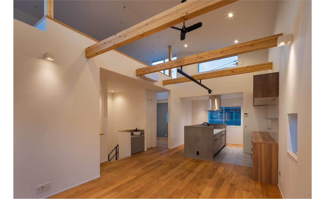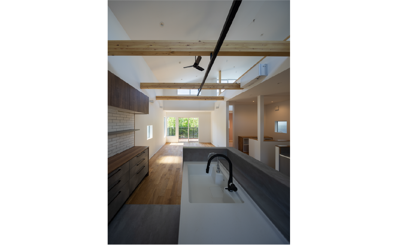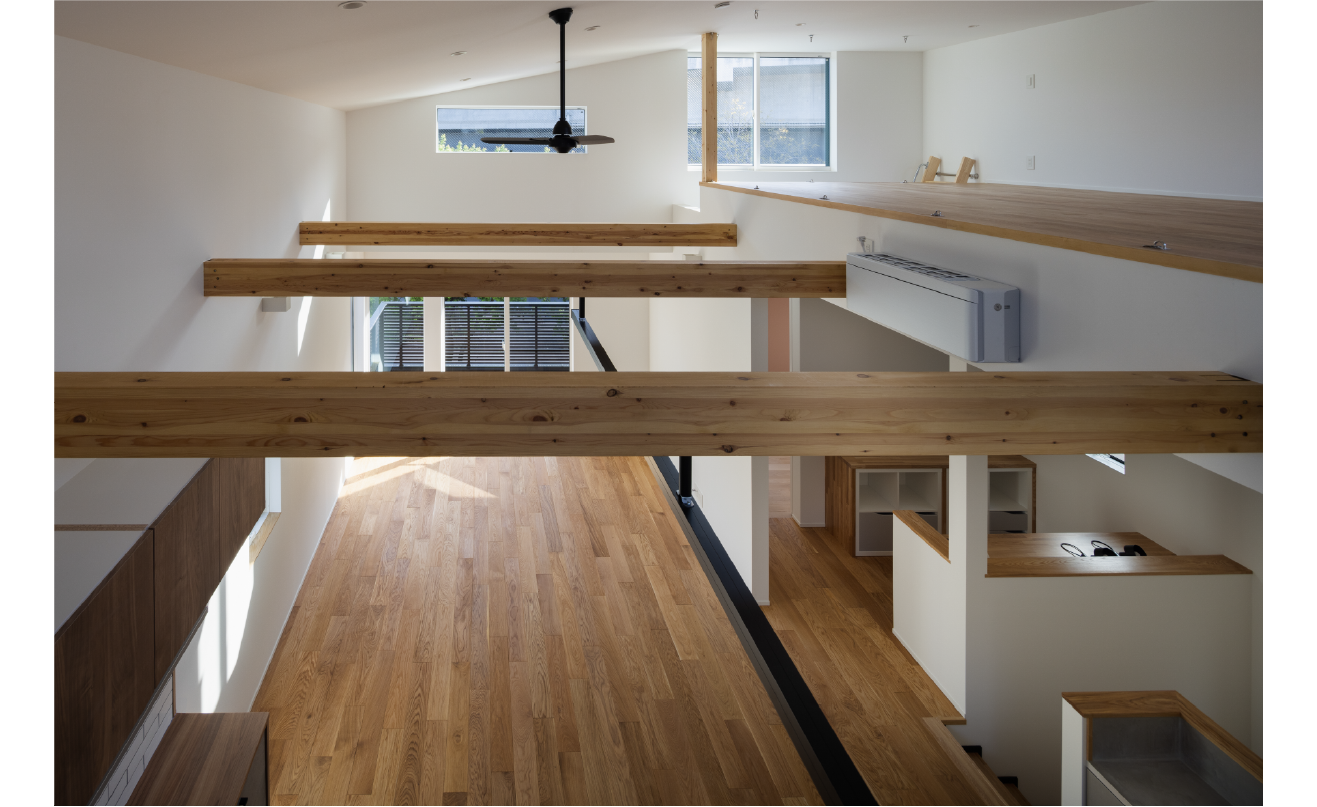 また、LDKが生活のメインストリートとなるようにプラニングし、LDKに面する子供部屋はパーティションのような半個室とすることで、2階全体が大きな1室空間でありながら、適度なプライバシーを確保できます。