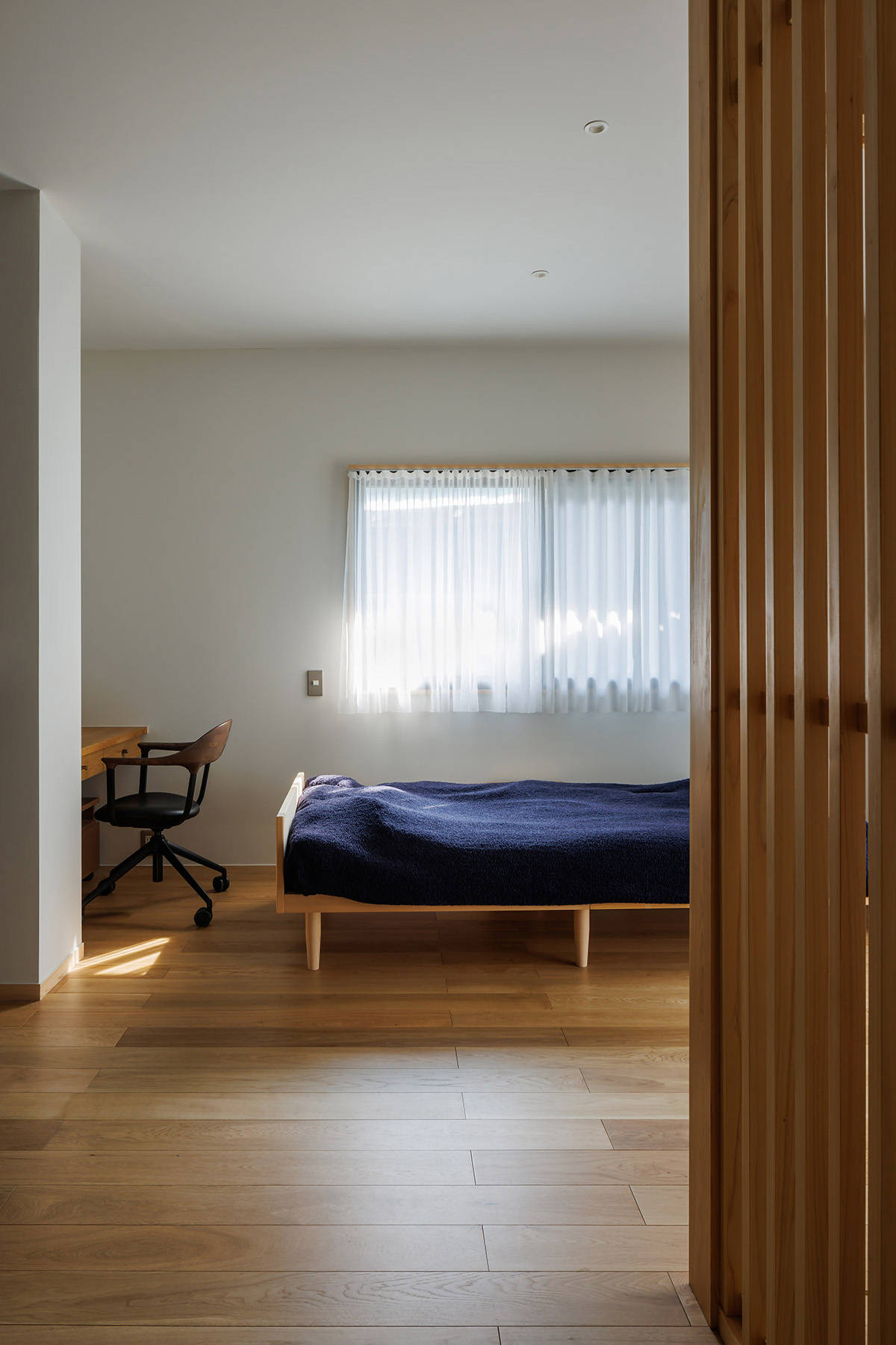 ベッドの隅には既存の造作デスクを移設した小さなワークスペース。