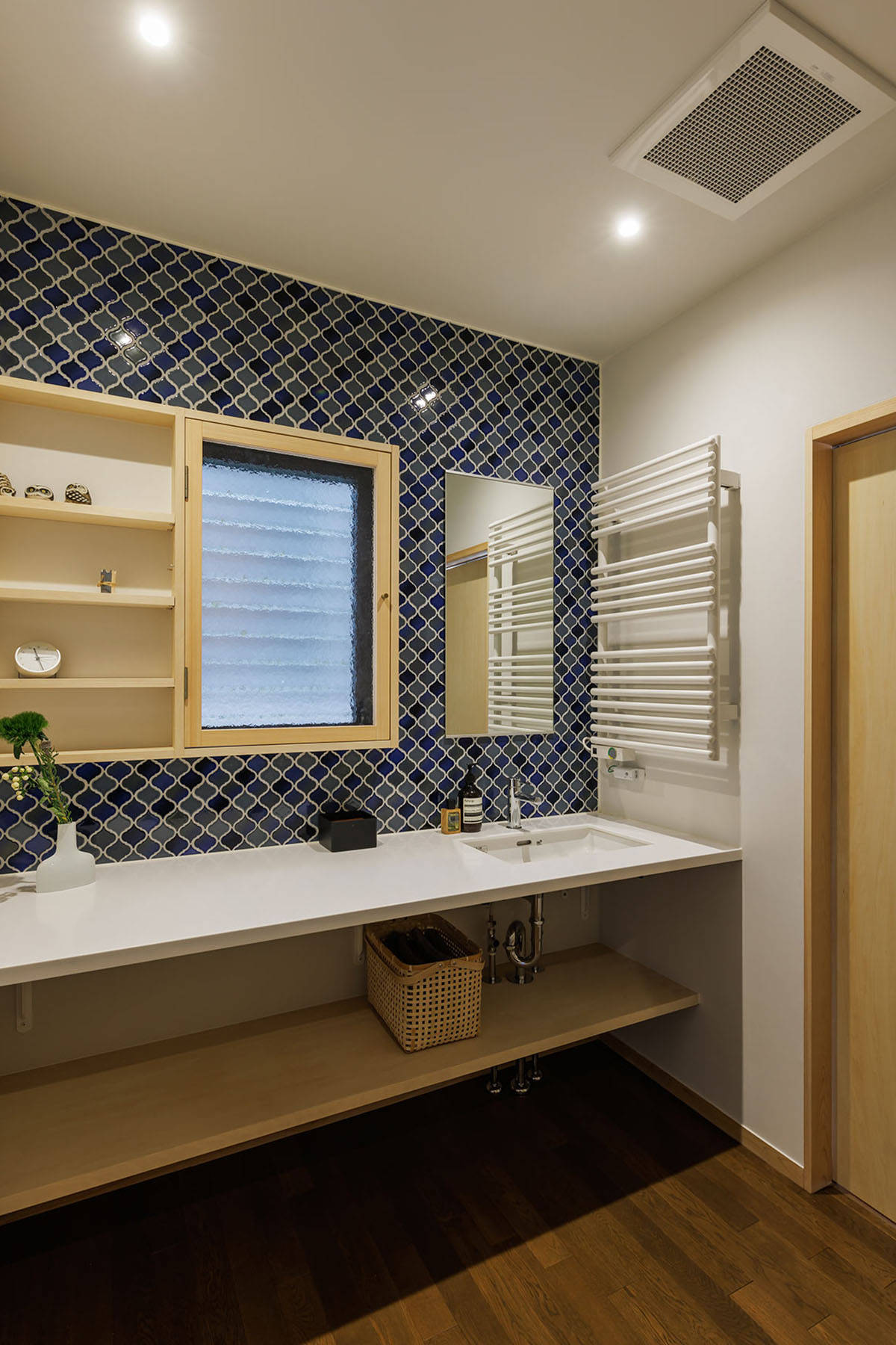 ランタンタイル貼りの洗面室。幅広の人工大理石カウンター。小窓と棚板を組み合わせたキャビネットを既存サッシに嵌め込む。