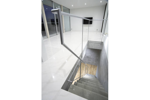 ●FU-HOUSE 14 ruins 川崎市の傾斜地に建つ混構造2階建ての戸建て住宅である。傾斜地の中腹に位置し眼下には広大な景色が広がっている。小さな中庭があり、プライベートな外部空間を楽しむことが出来るようデザインされている。(プロデュース:ザ・ハウス)