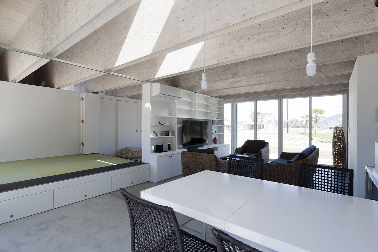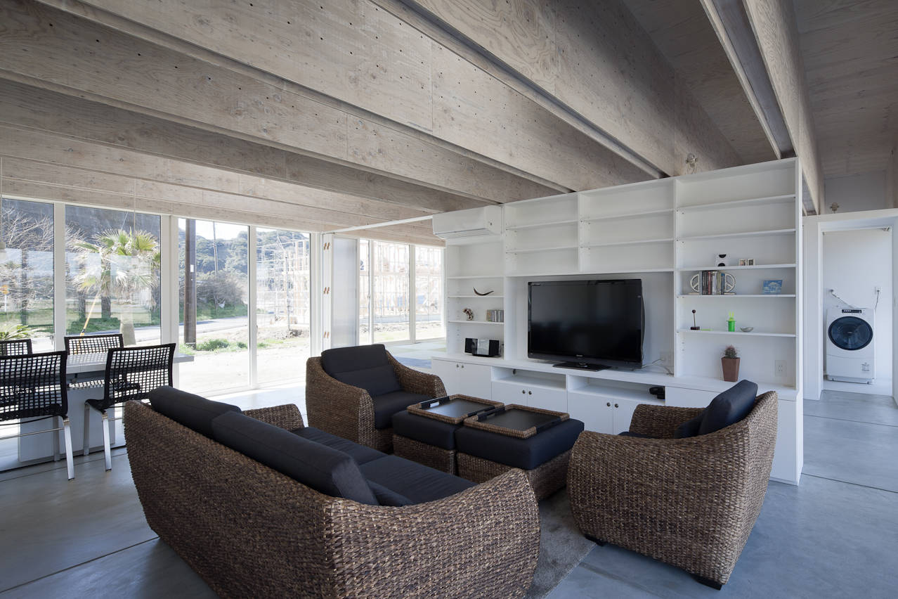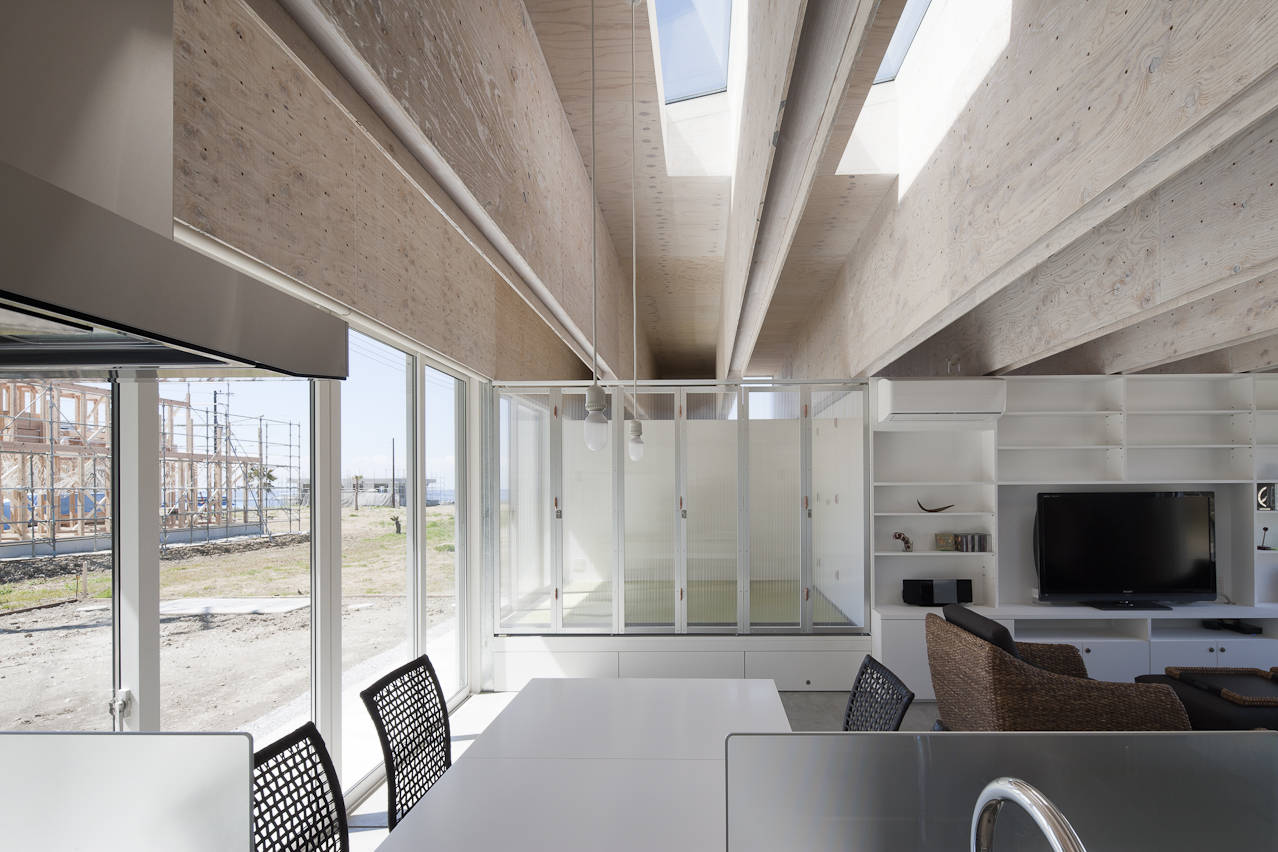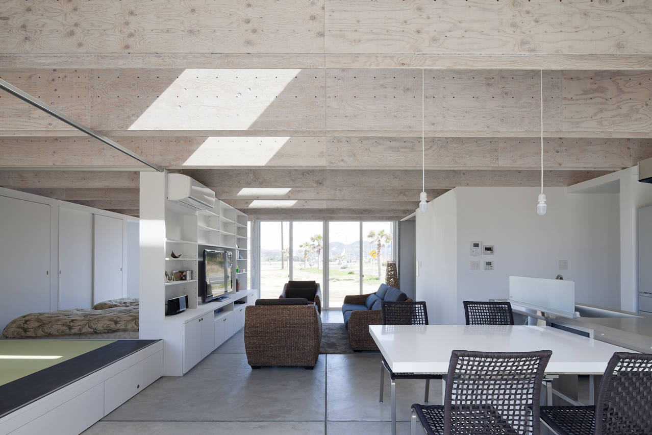 屋根は成900mmの巨大な木造合成梁(上下弦材を合板でサンドイッチした梁)を東西方向に飛ばし、幅600mmの耐力壁を平行に並べた列を2列作り、南北面が全て開口となる無柱の開放的な筒状空間を実現した。また梁下までに収められた壁、建具、家具によって平面を緩やかに分節し、梁成の空間では全体をつなげることで室内に一体感と適度な距離感を作り出している。