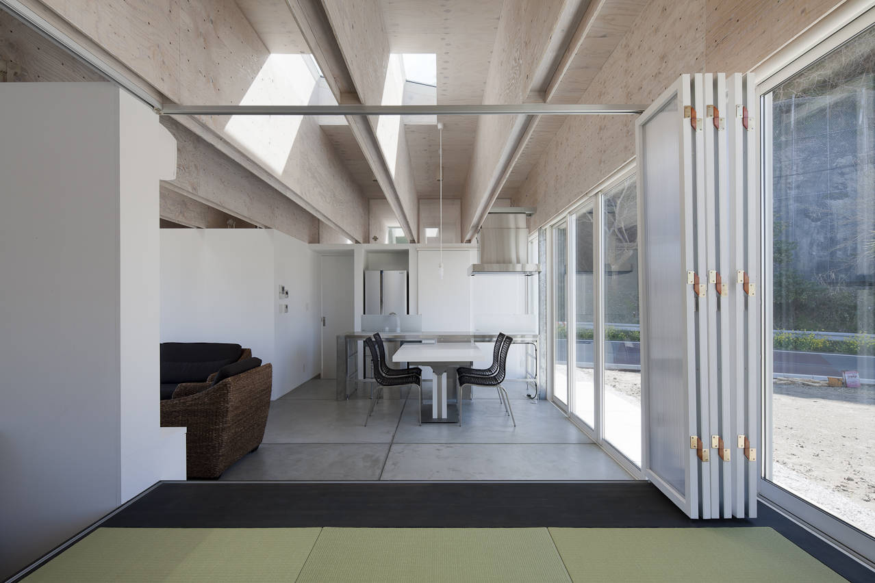 床はべた基礎の上にモルタル仕上とし、基礎の側面、底面を断熱材で包むことで蓄熱層とした。蓄熱層からの輻射で室内環境を制御することで、サッシを開放しても室温が外気に影響され難い真に開放的な室内環境を可能とした。外断熱工法、屋外壁通気工法、蓄熱式低温輻射式床暖房(これら室内環境制御技術)を採用し、真に開放的な空間を工業部品を単純明快に組み合わせることで実現した。