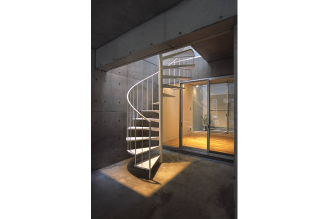 ●HAPPY-HOUSE 11 luce 江戸川区に建つRC造3階建ての二世帯住宅である。1階北側に親世帯の部屋があり、吹抜けと中庭を通して光と風が通るよう空間的工夫がほどかされている。(プロデュース:ザ・ハウス)