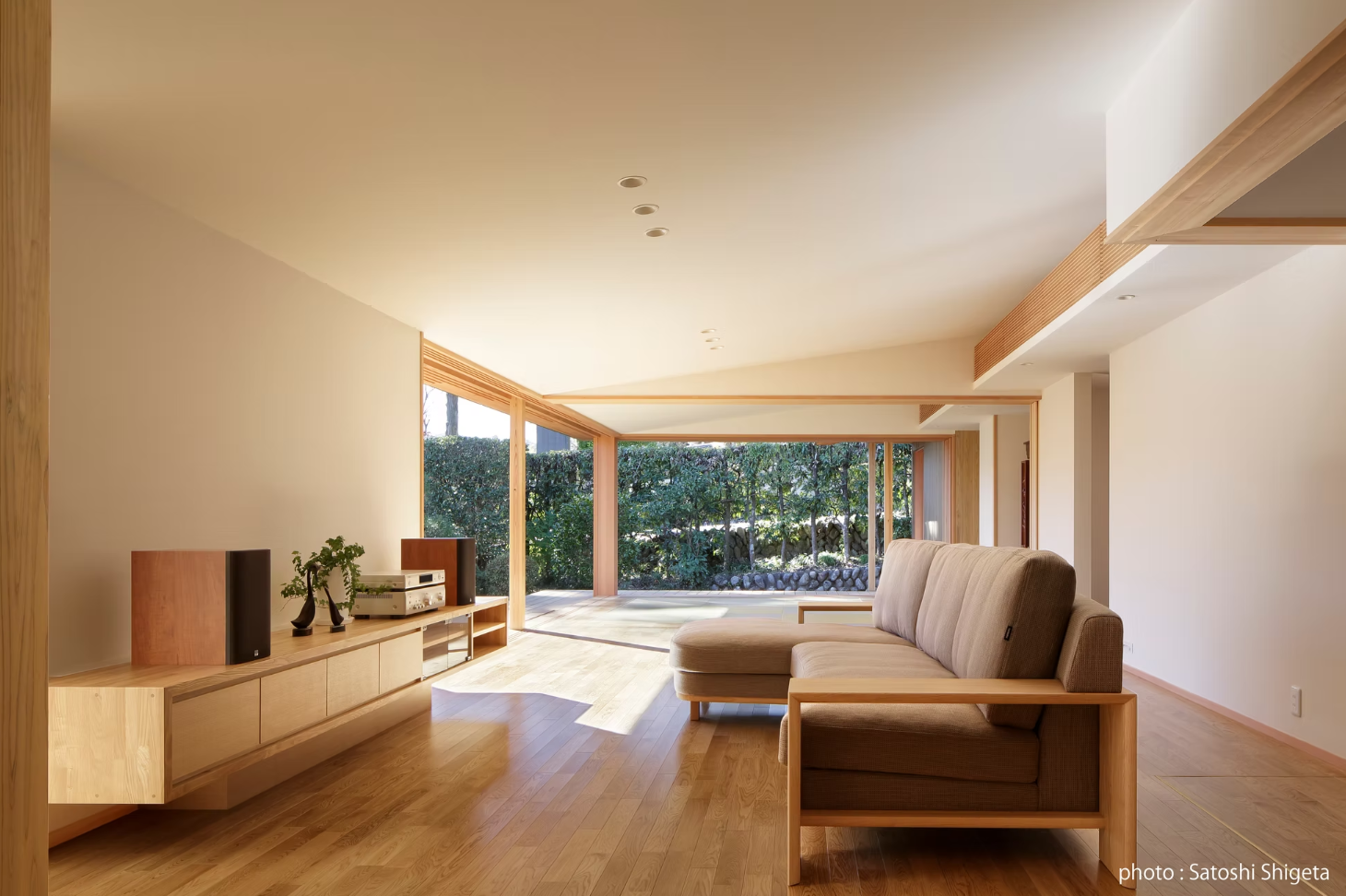 メインとなるリビング天井は庭に向けて片流れの勾配をとり、天井まで確保した開口を壁内に引き込むことで、外の光が天井面に反射しながら優しく奥へと導かれ、内外の連続性に奥行きを生み出している。