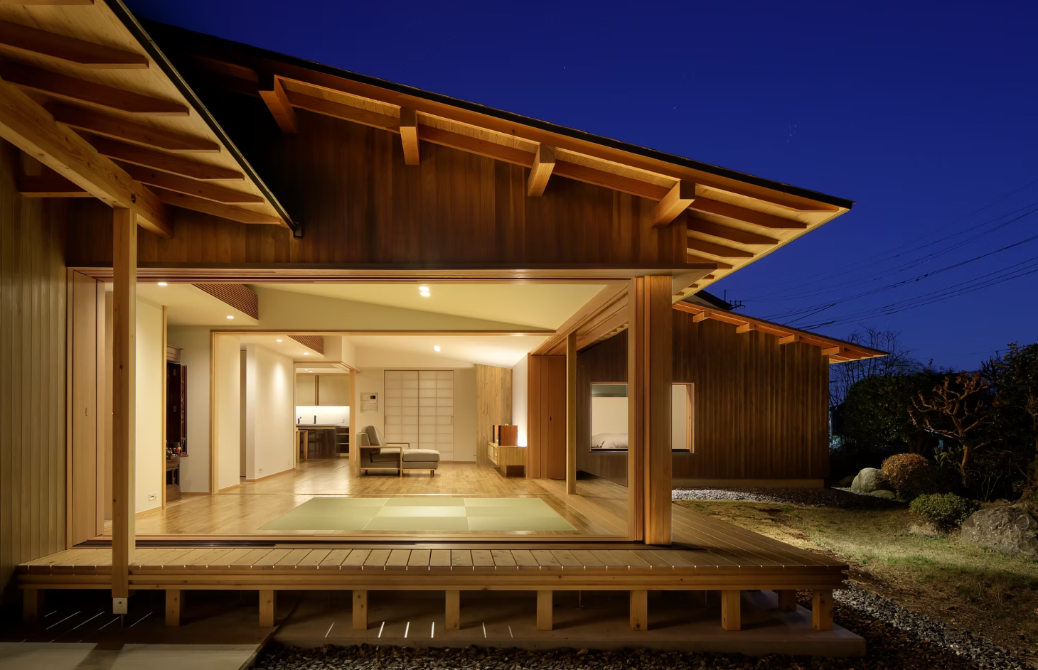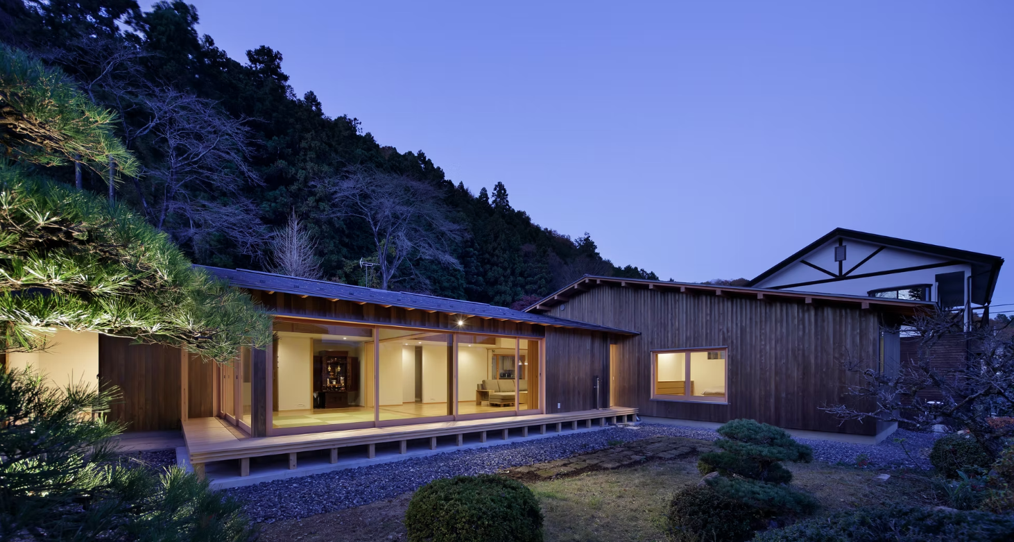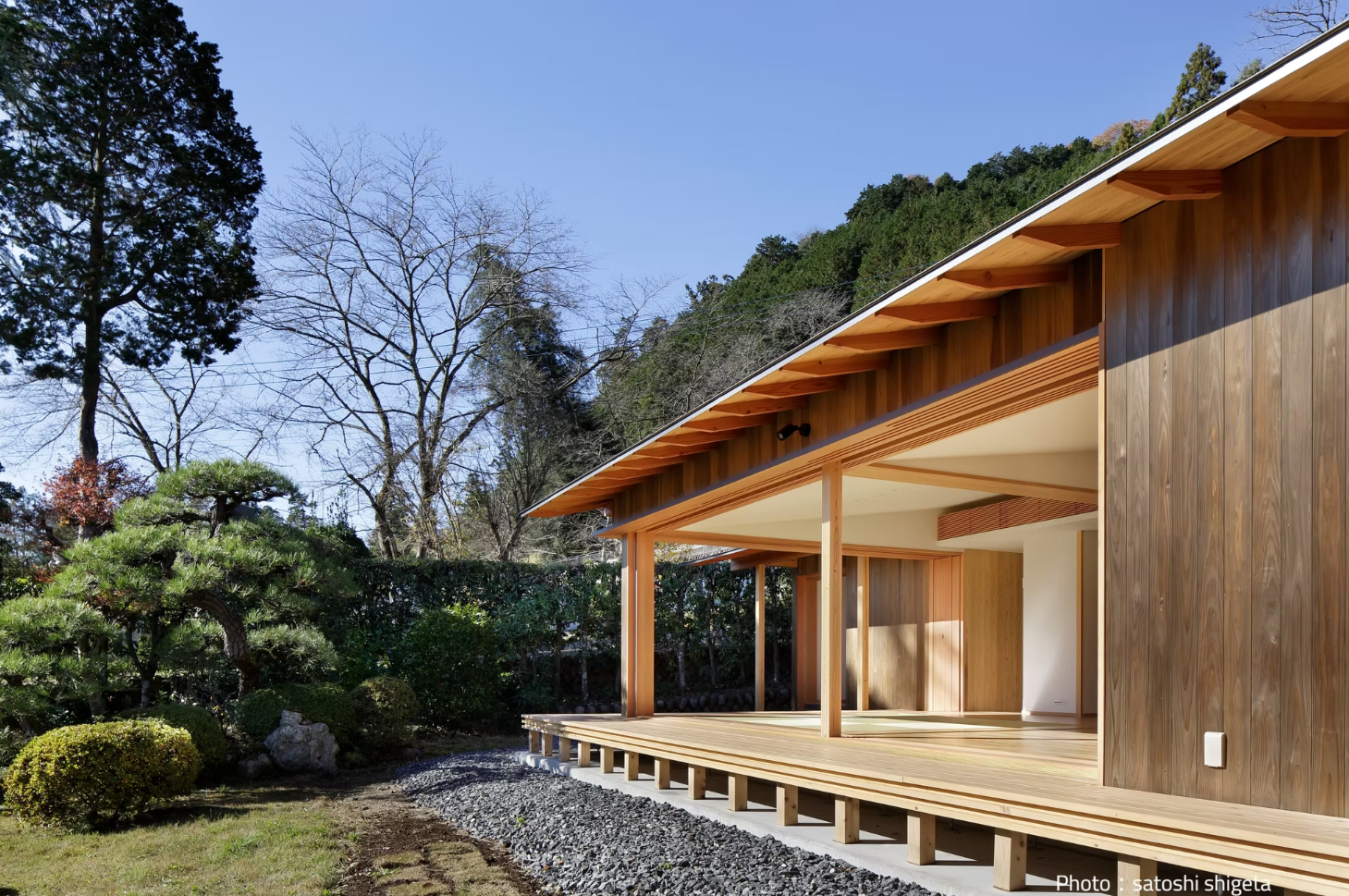 のどかな里山風景と神社への参道に囲まれた住宅の建替え計画。既存の庭と松を活かしたいという要望に対して、雁行配置により建物と庭を市松模様のように描いている。