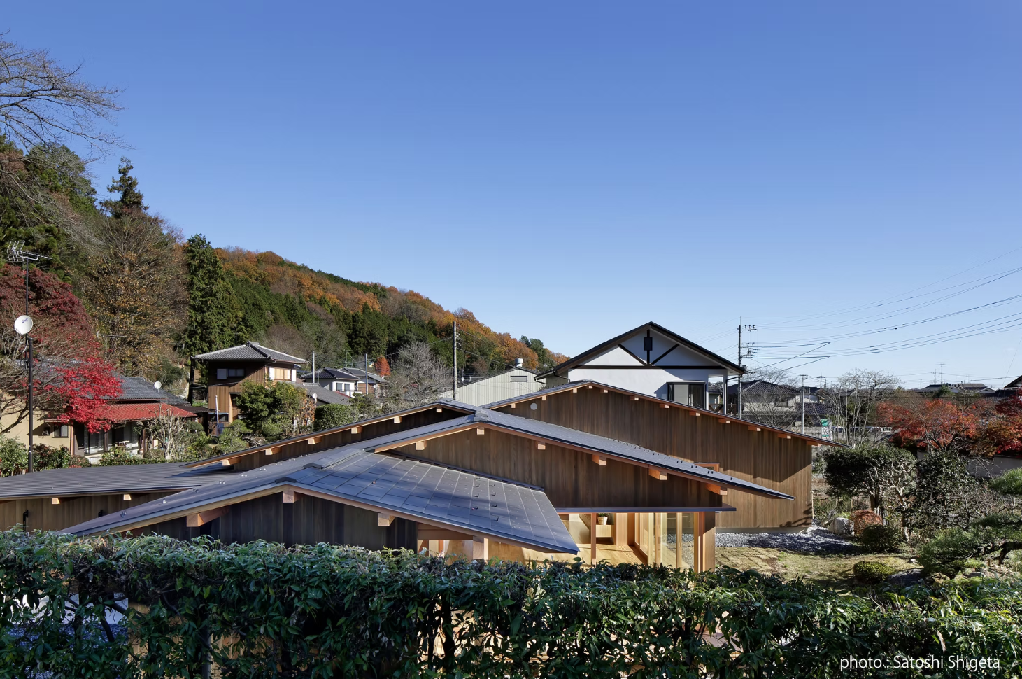 屋根は平面形状に合わせて切妻を切り替え、場所に応じて異なる棟の高さが山の連なりのように見える。外壁の杉板と相まって馴染みながら、周辺環境と暮らしに根差す建築となった。