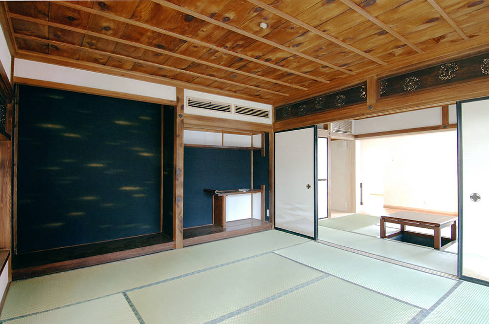まずは既存建物を大工さんの手作業で丁寧に解体し、新たなRC造の躯体が出来た後にその内部に木造座敷を移築します。移築と言っても実は簡単ではありません。とてもしっかりできた建物とはいえ150年以上経っていますので傷んでいないわけはありません。天井板も襖も障子も2部屋分を解体し状態の良い1部屋分の材料を使いました。中でも床の間の襖絵は調査した結果江戸時代の絵師のものでした。写真に写っていないのは修復中だったからです。