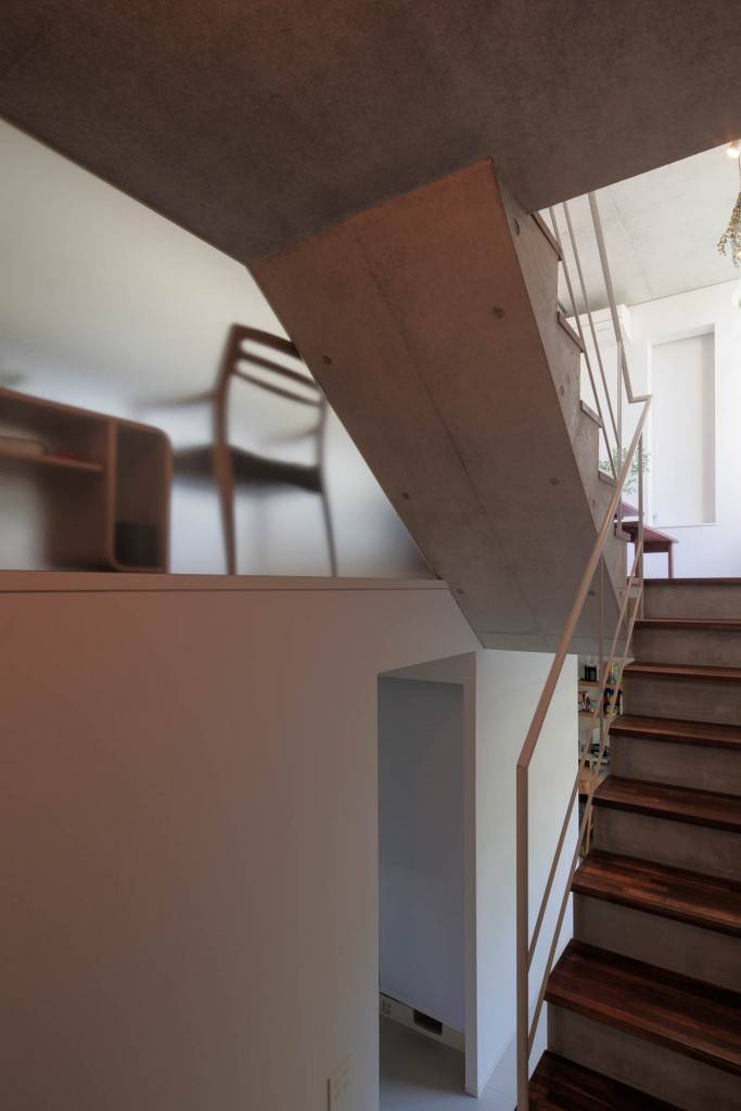 半地下から屋上テラスまで高さの変化に富んだ住戸の外形を、スキップフロアでひと繋がりの構成にしながら生活の場をつくっています。