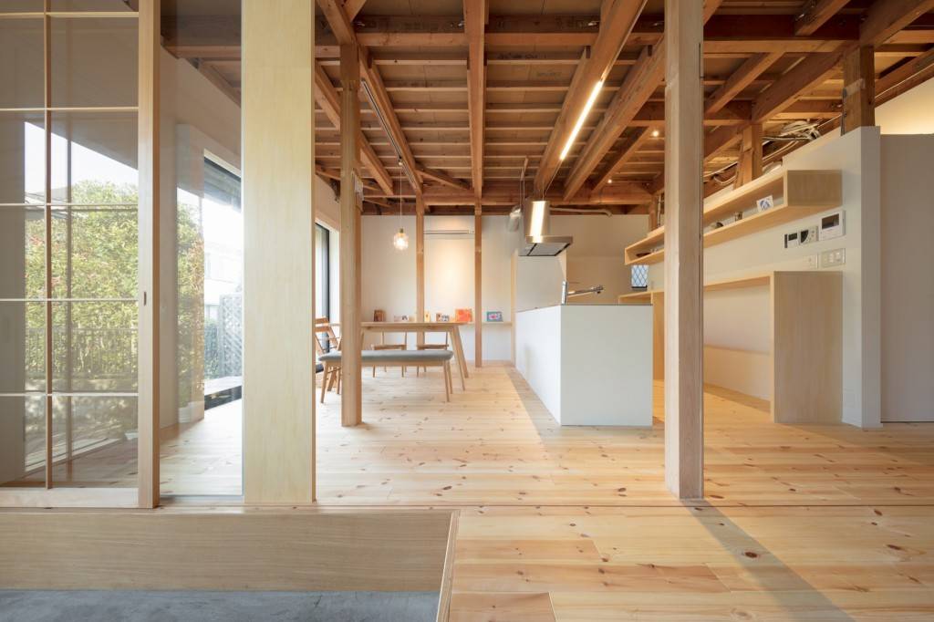 一階の半分では、木の床がキッチンから道路まで点在しながら居場所を広げています。