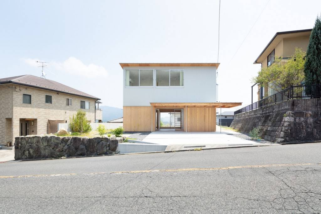 南北にも東西にもひな壇上になっている宅地の中で、この家は周囲とは少し違った角度の配置となります。隣家とは正面に向かい合わず、斜面地を自然と見下ろすように厳島へと視線が向けられます。道路からは、家の周囲にできた庭へと視線が抜け、その先の海の存在を道往くひとに知らせます。