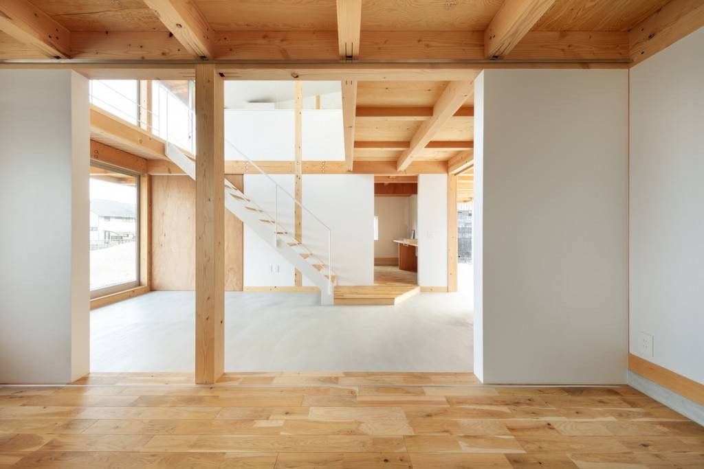 家の平面は民家の田の字プランの真ん中に土間と吹抜けを通したシンプルなつくりで、上下階がほぼ同じ構成です。土間と吹抜けは周囲にできた庭と同じくらいのサイズで家の中央を貫いています。