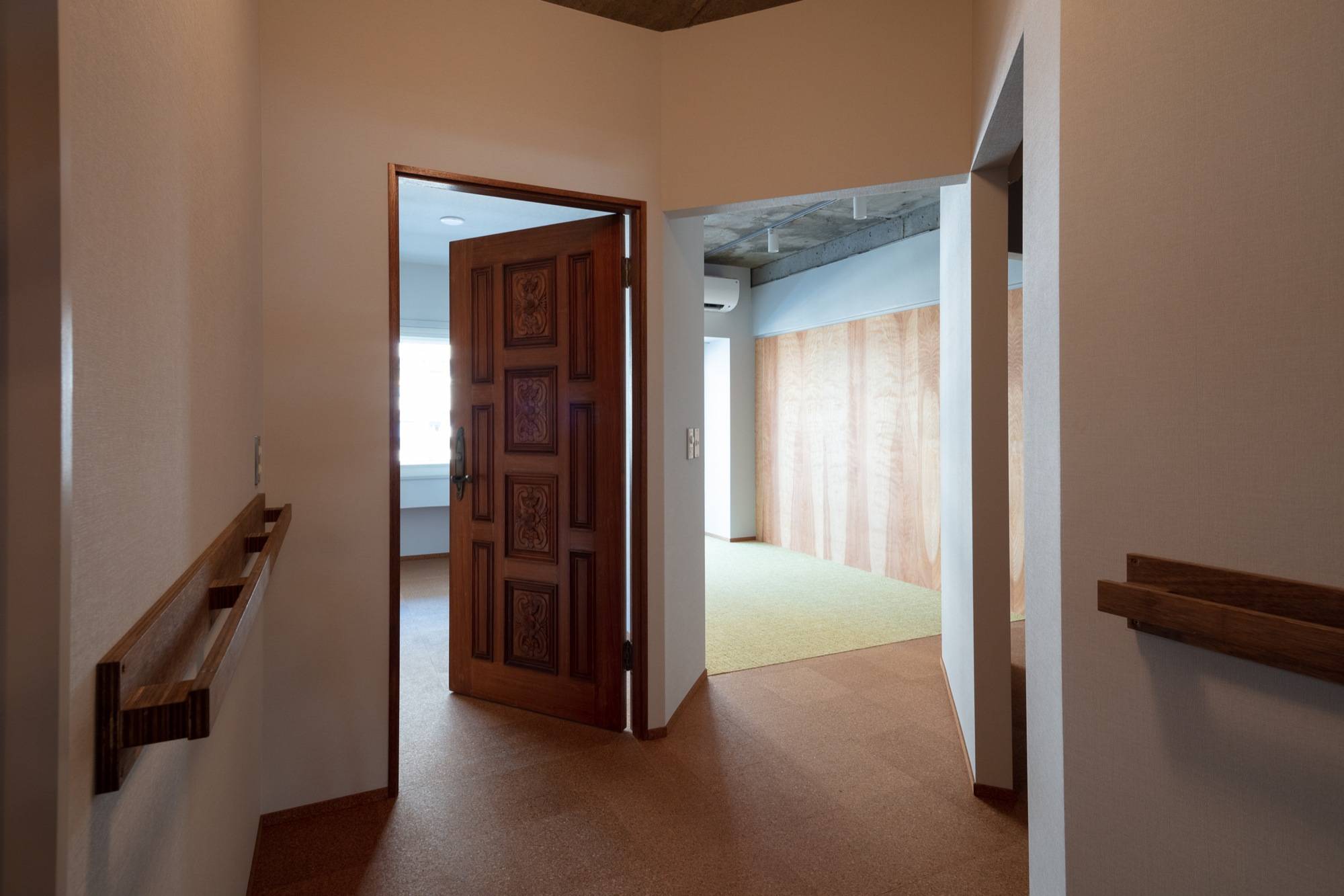 どこにいても手の届く範囲にものがある。その距離感でできた場所は、大きなワンルームでもあり全てが動線からできているとも言えます。移動と滞在の行為が連続していて、ピットインのような居場所が点在しています。車椅子がなるべく行き止まりにならないように回遊性を持たせたり、少し広げた廊下は寄りかかれる手摺りも相まってどこでも居場所になれます。人の動く道の延長は、光や風の動線とも重なります。