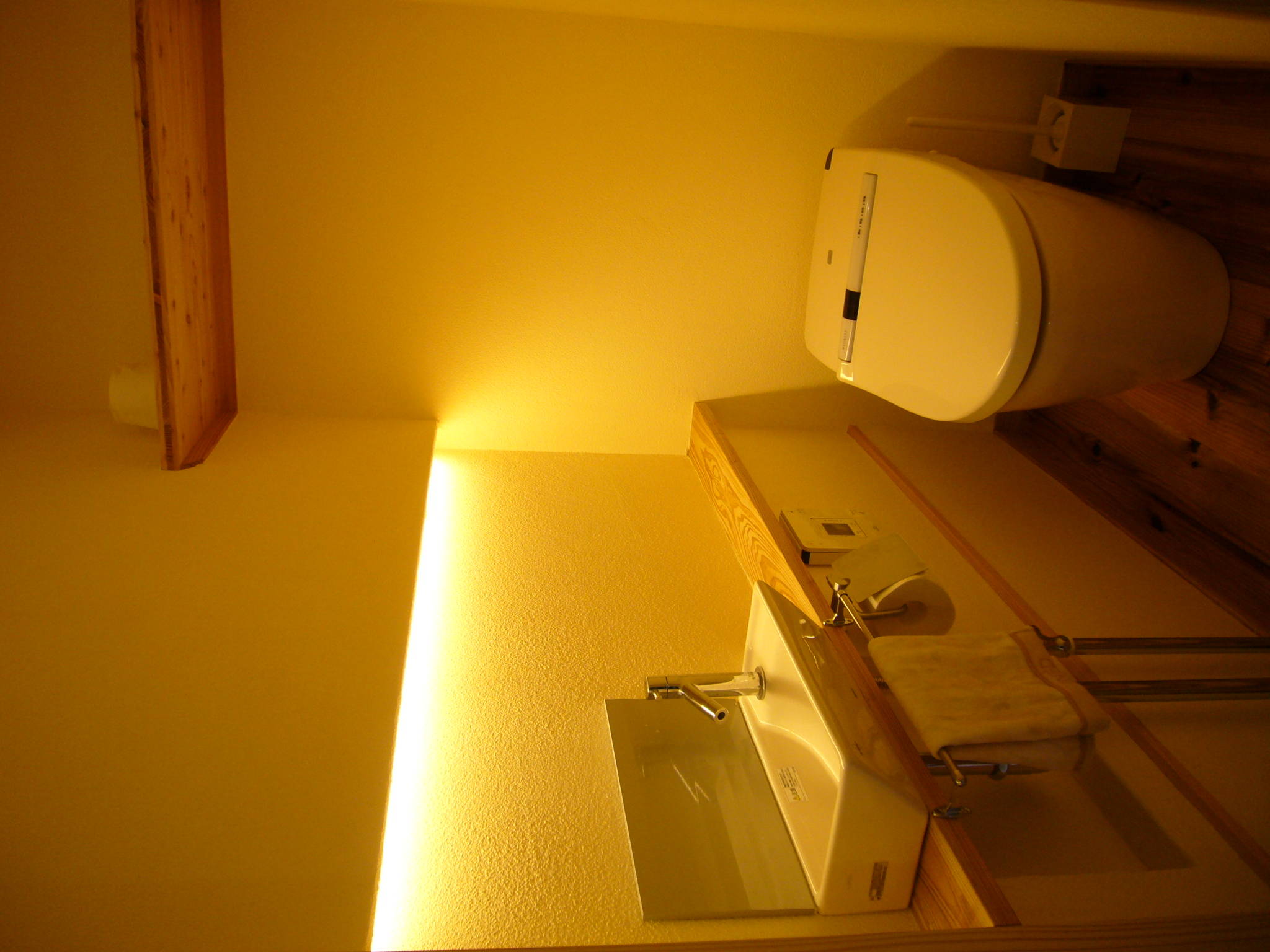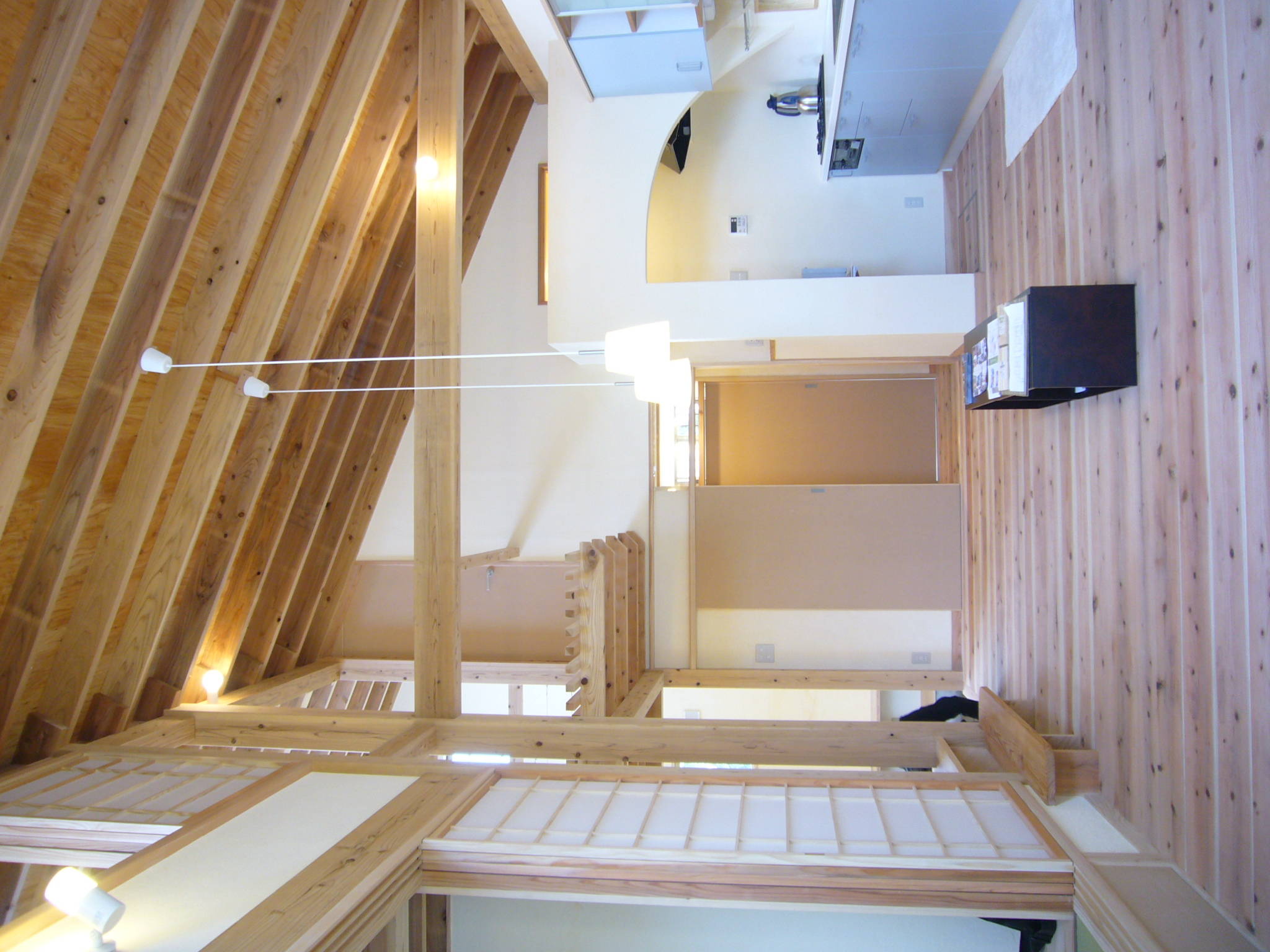 ここでこだわったのは、「高品質な本物の木の家」を「ローコスト」で実現する事でした。多くのローコスト住宅が安普請になってしまうことへ対抗して、この価格の家にこんな高価な木材が使えるの。こんなすてきな自然素材で出来るの。といった住宅を目指しました。そして、実現しました。例えば、壁天井は洋風の漆喰塗り、床は厚さ30mmの杉板や厚さ15mmの信州から松、また浴室の壁は国産ヒバの板張りです。