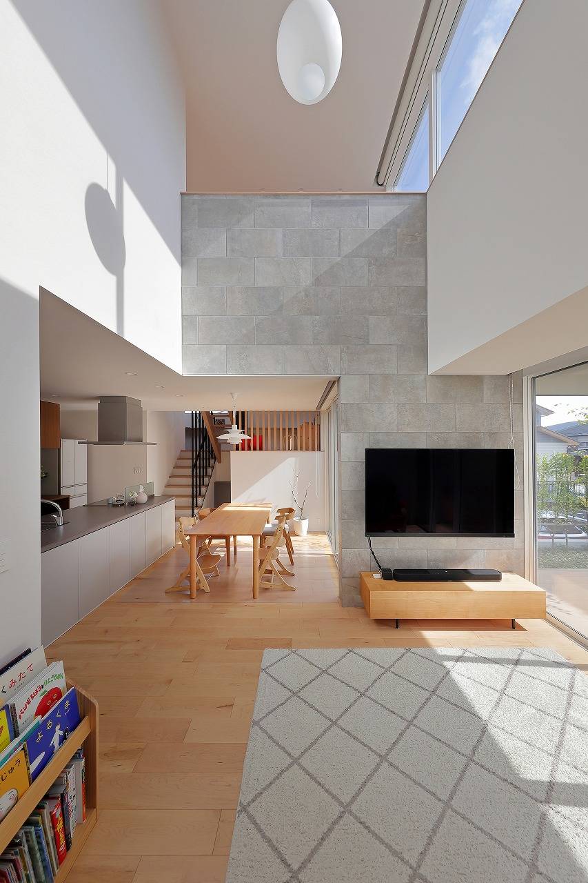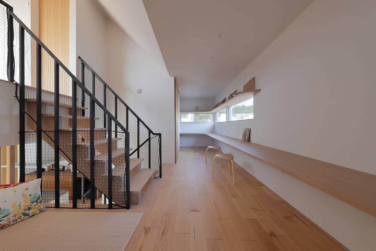 玄関からLDK へのアクセスや、階段を通じて二階のライブラリーやそれぞれの居室へ空間がシームレスに繋がっており、回遊動線で繋がれたそれぞれの居場所は、互いを感じながらそれぞれの居場所を楽しむことができます。