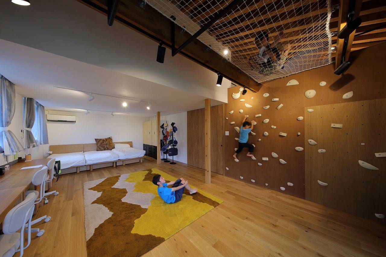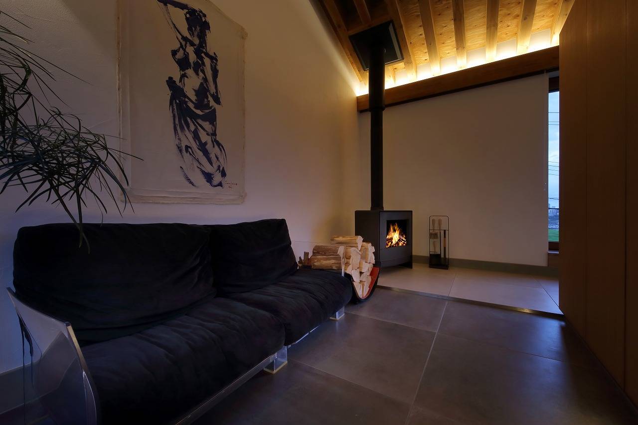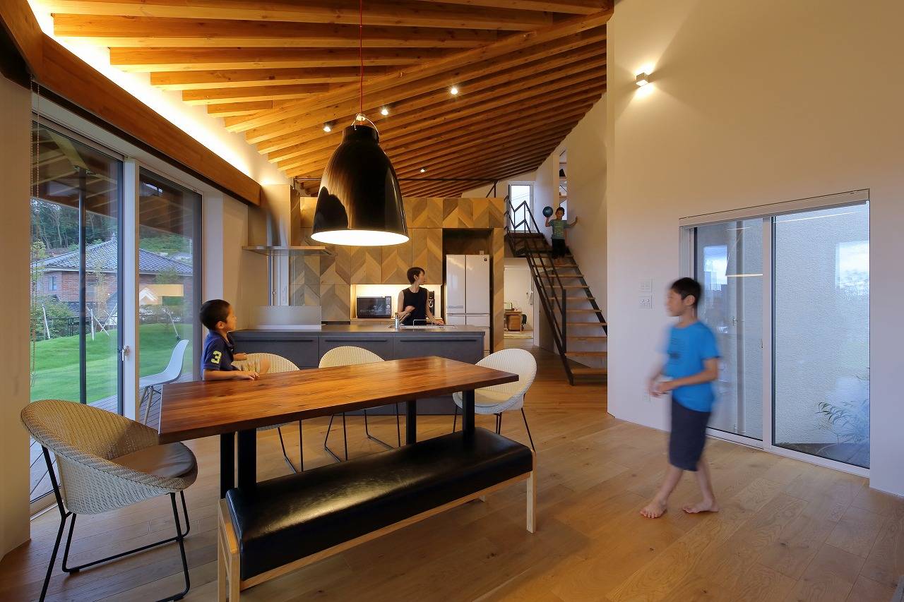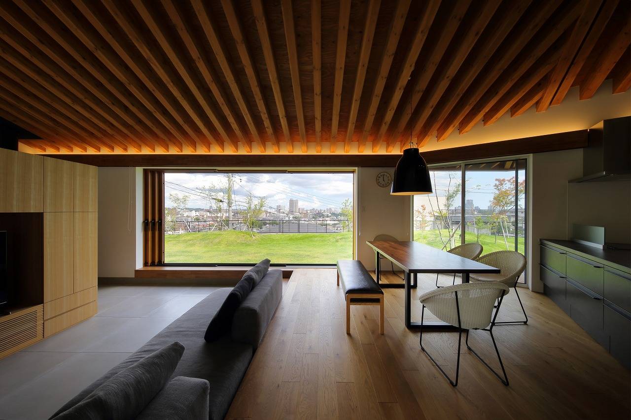 広瀬川沿いの河岸段丘にある敷地特性を活かして、段丘の一部を切り取ったような外観に洞窟のような内部空間をイメージしてプランニング。現した梁が続く天井が、ひとつながりの空間を演出しています。朝日を望める東側の眺望を楽しめる特等席にリビングを配置し、1段下がった高さにソファを置くと目線がさがることで外の景色との一体感を感じられます。⠀