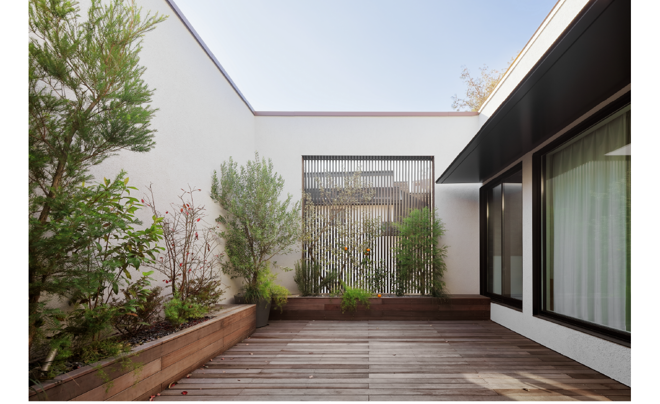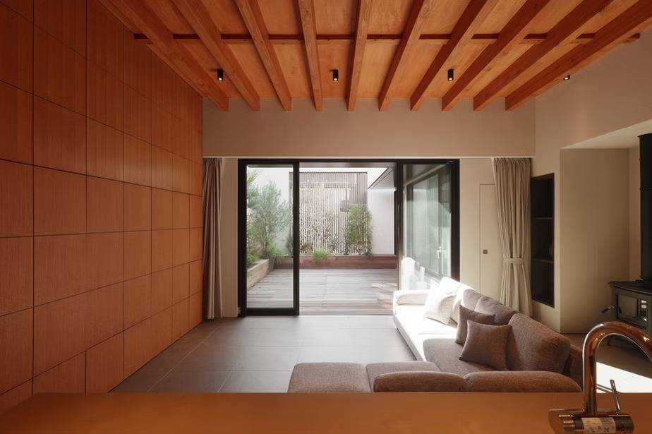プライバシーを保ちながらLDKを屋外に開放するため中庭を設け明るく風通しの良いLDKを実現しました。