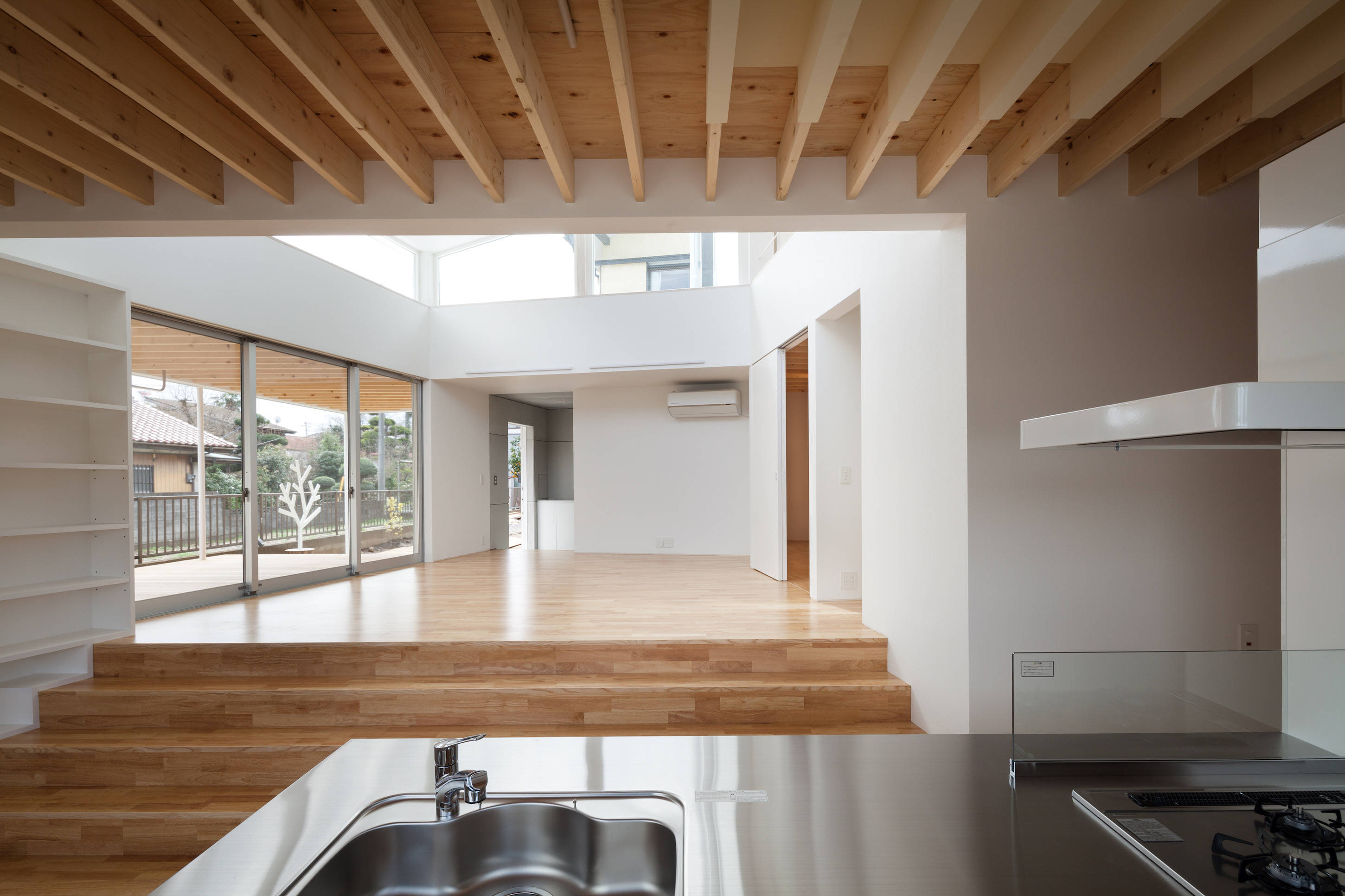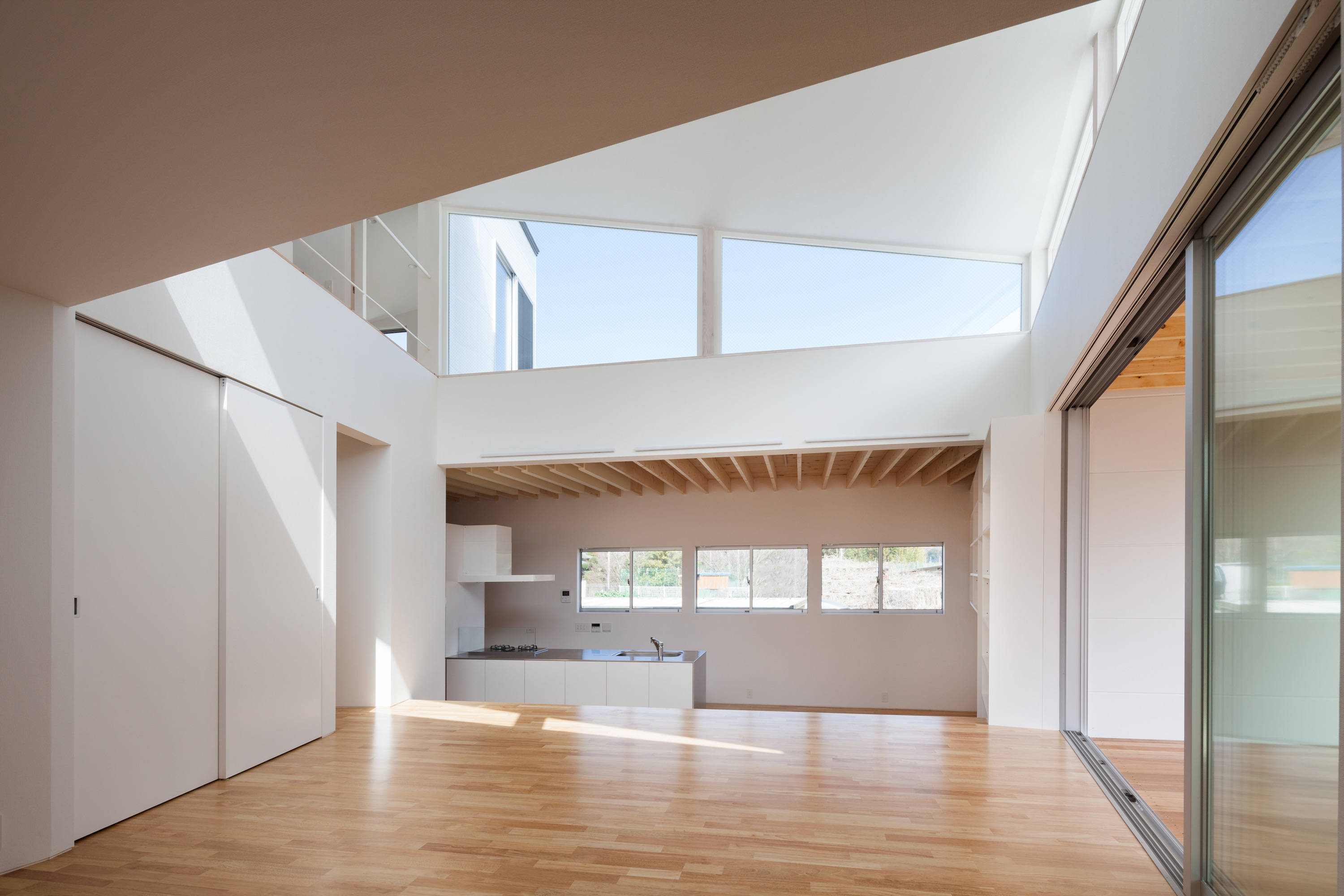 敷地南側の隣地は空地でしたが、将来隣家が立った時のことを踏まえ、リビングを旗竿敷地の旗の中央付近に。リビングは天井高く、その周りを諸室が囲うプランにしました。