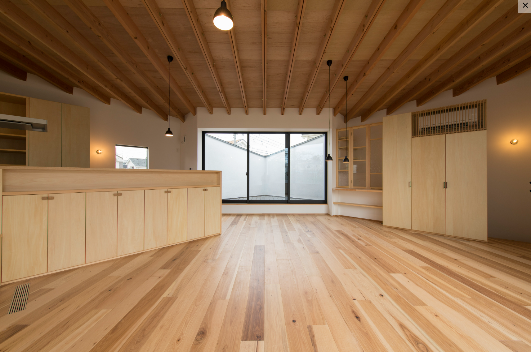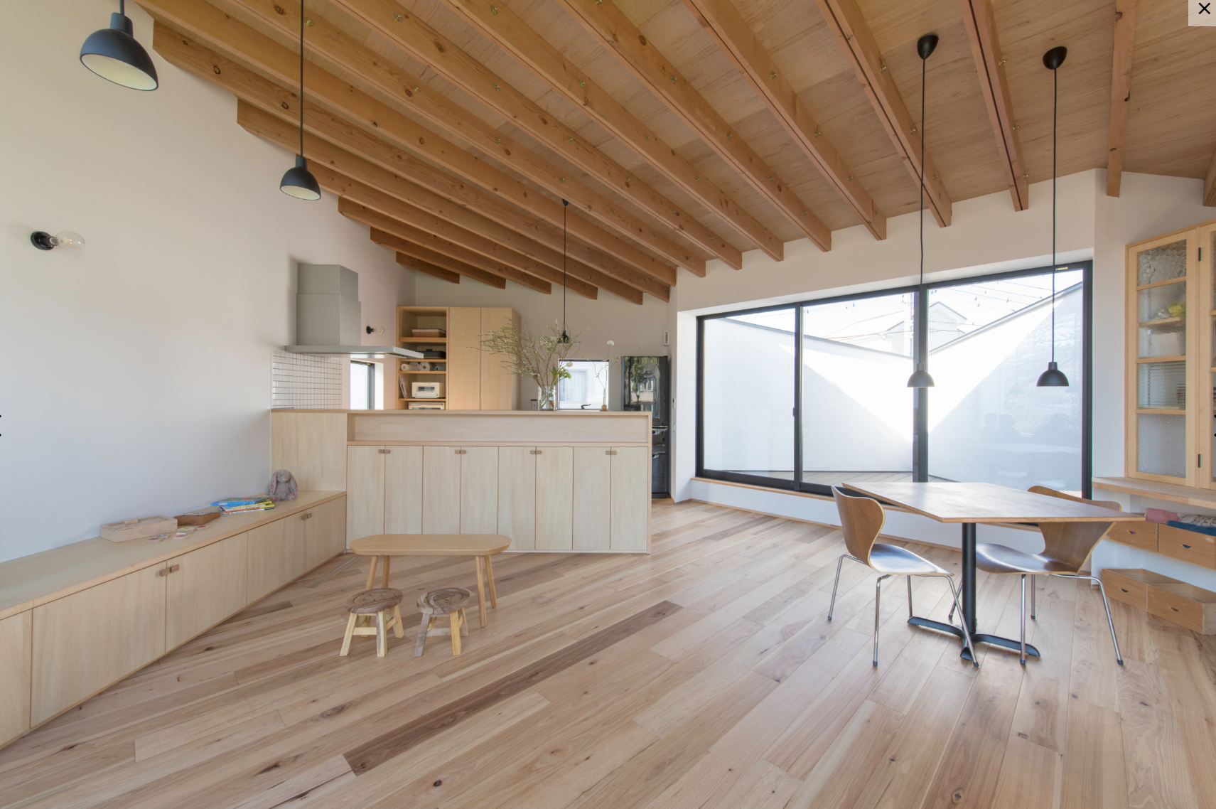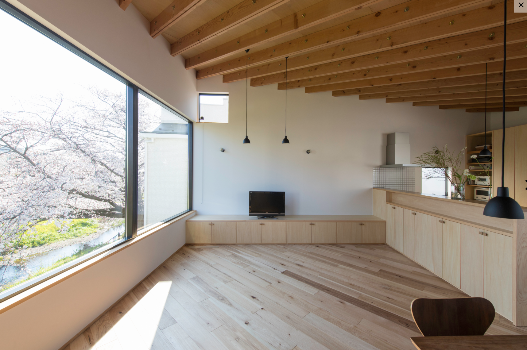 前面道路が南側にあり、道路に対してどう開くか、北側にある川と桜に対してどう開くかを大切に考えました。一番は桜の木のある景色をいかに取り入れ、楽しむかということでした。北側にある川に対して大きな窓を開けて借景と安定した光を取り入れ、南側にはバルコニーを設けてプライベートな空間としました。室内はゆったりとおおらかな空間になるよう、細かく区切らず、天井形状も工夫しています。暖房は建てもの全体で快適と過ごせるよう、床下を暖めることで全体を暖める方法を計画しました。