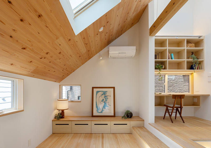 包み込まれるような勾配天井のリビング、吹抜の開放的な明るいワークスペース、落ちついた雰囲気のダイニングキッチン、と 各所が 空間の変化を感じさせる造りになっており、家族が その時々で 自分の居心地のよい場所を見つけ、自然と 集まりたくなるようなLDKになっています。