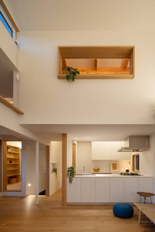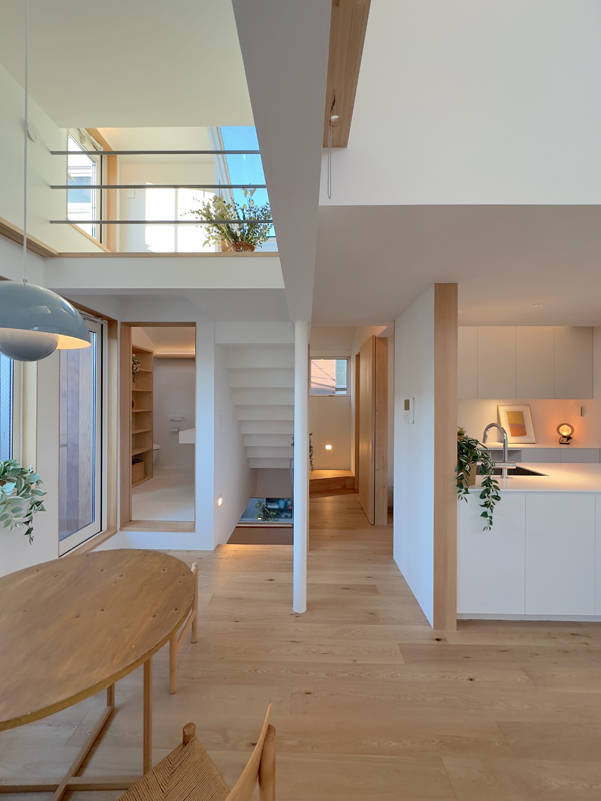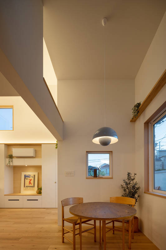 LDKでは場所ごとに 天井の高さが変位し、また光の取り入れ方による空間の明暗にメリハリを付け、 それぞれキャラクターが異なる、多様で愉しい空間が連なっています。