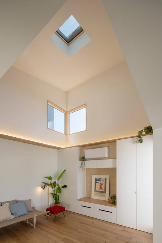 厳しい高度斜線規制のもと、1階居室においては 階高をおさえ、2階のほうにボリュームを大きくシフトすることで、 開放的で明るい、大空間のLDKを実現しています。