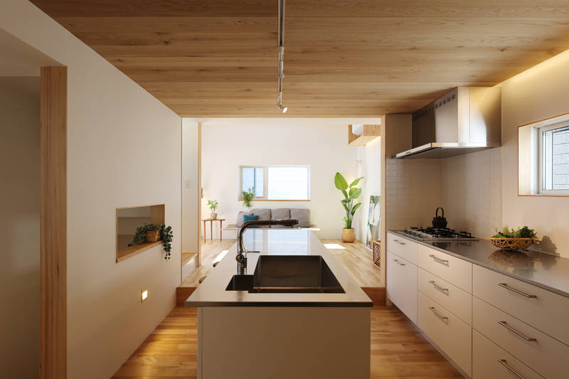 キッチンは家全体の中心の位置に据え、皆で廻りに集まりやすく、誰もが楽しく料理に参加したくなるような、さながら家族のキッチンスタジアムのような役割を担っています。