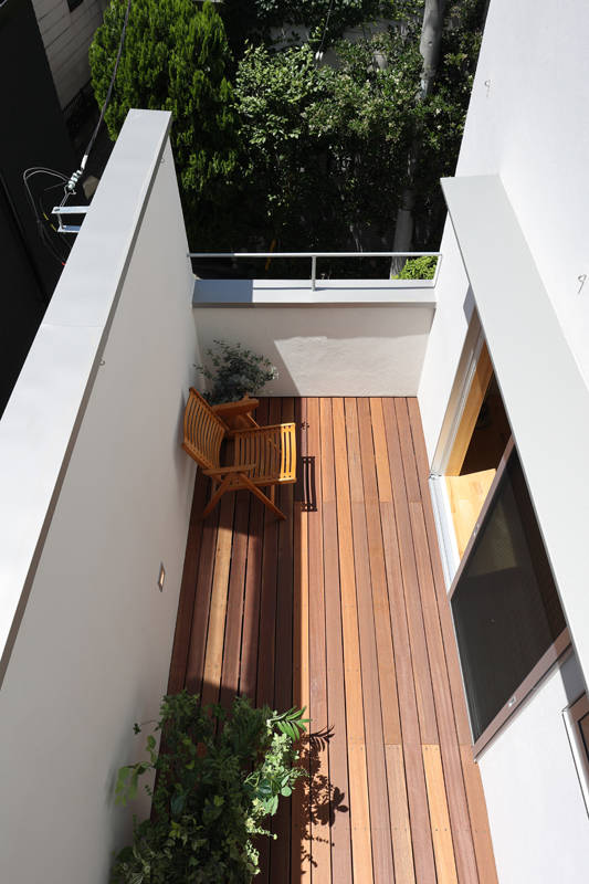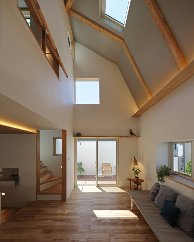 南、西、北の三方から立ち上がる建築基準法の斜線制限による限られたボリュームの中で、必要十分な空間を確保していますが、それでいて、内外の各空間が相互に繋がり、家族が互いに気配を感じあえるようにするとともに, 視覚の「ぬけ」を随所に設け、実面積以上の広がりと開放感が感じられるようにしています。