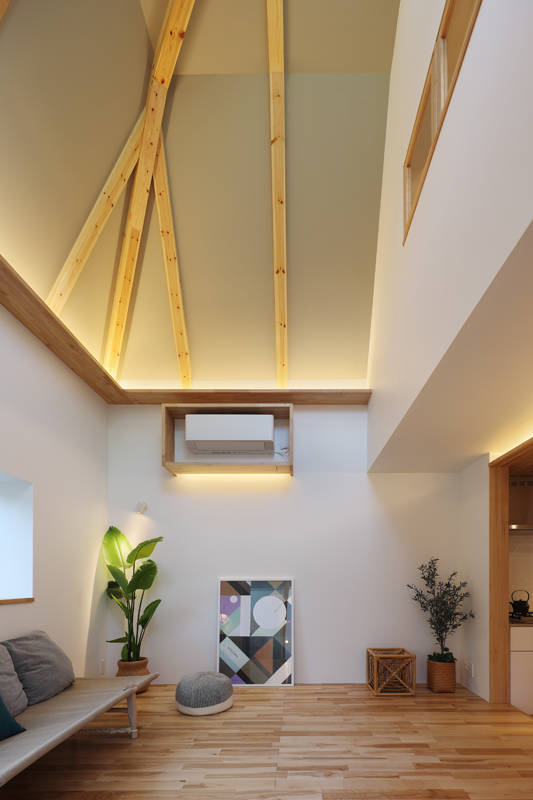 三方から立ち上がる屋根を腰折れとし、その構造を敢えて露出することで二つ吹抜空間をよりダイナミックで印象的なものとしています。