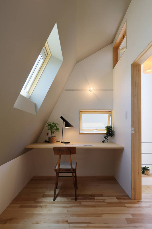 これらニつの子供室は、それぞれ吹抜を介してリビングおよびダイニングと繋がり、子供達が家族の気配を感じながら自室で過ごせるようにしています。