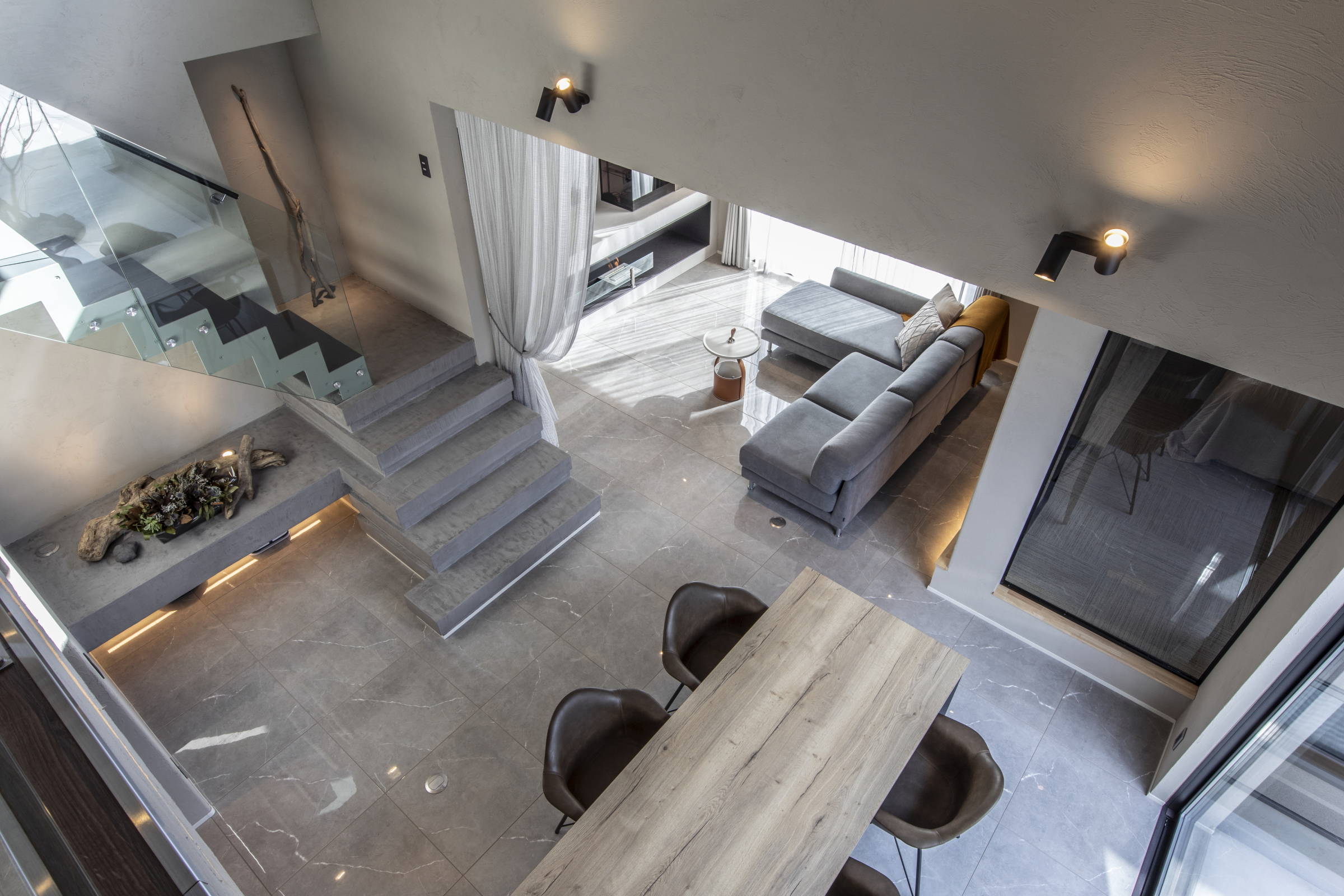 玄関ホールからLDKへと続く床タイル、ガラスとモールテックスを取り入れたオーダーメイドの階段、LDKの入口の配置したシルエットが美しいガラスドアなど、とことん素材やディテールにこだわりました