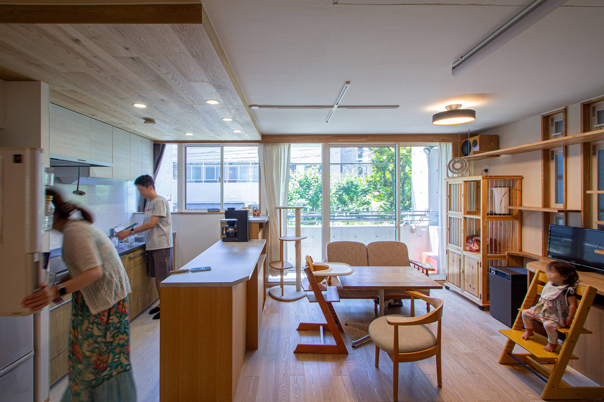 天井高さ2.3mの中に、立体的に居場所を配置し、回遊式で、抜け感のある空間は、面積以上にゆったりと感じられるマンションです。家族のライフスタイルにあった、オンリーワンの間取りにガラッと変わったリノベーションとなりました。
